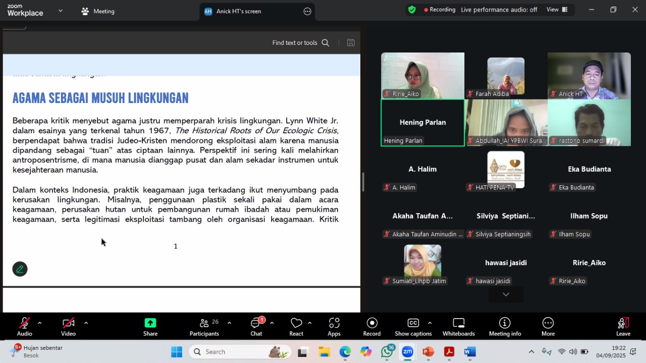 Hening yang juga Koordinator Nasional GreenFaith Indonesia menekankan bahwa agama bisa hadir dengan dua wajah. Ia bisa menjadi musuh ketika ajarannya disalahgunakan demi kepentingan politik dan ekonomi. Namun, agama juga bisa menjadi sahabat ketika ditafsirkan secara kontekstual, progresif, dan berpihak pada keberlanjutan hidup.