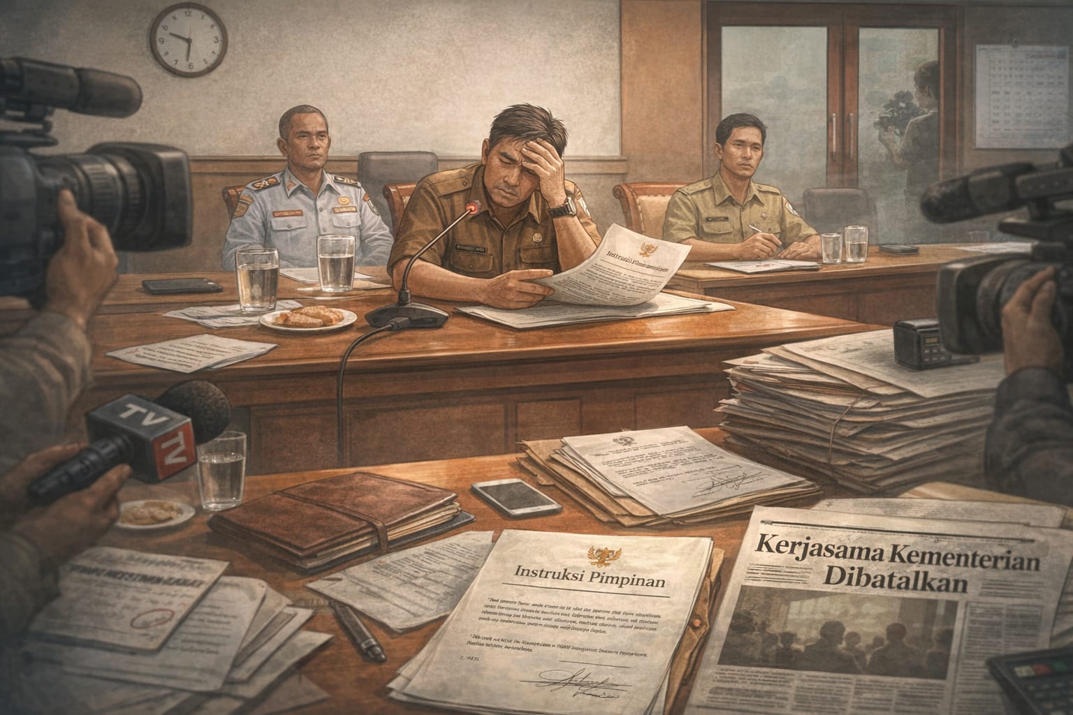 Kamera wartawan menyala. Pena bergerak cepat. Kata-kata tentang penyesuaian agenda dan arahan pimpinan disusun dengan hati-hati. Tidak ada yang berbohong. Tetapi juga tidak ada yang benar-benar jujur.