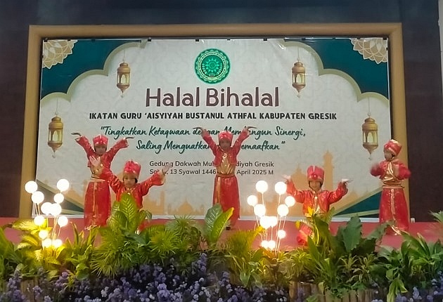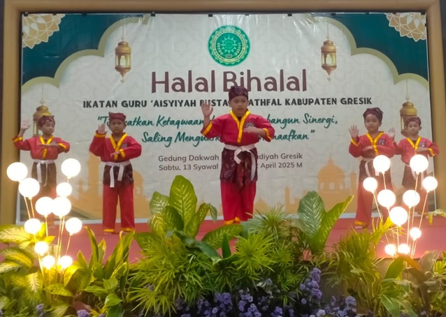 Tagar.co – Sabtu (12/4/25) pagi Gedung Dakwah Muhammadiyah (GDM) Kabupaten Gresik dipenuhi tepuk tangan hangat. Suasana Halalbihalal Ikatan Guru Bustanul Athfal (IGABA) Kabupaten Gresik berubah syahdu saat sepuluh bocah dari TK Aisyiyah 36 PPI melangkah ke panggung. Dengan busana warna-warni dan semangat yang menyala di wajah mereka, anak-anak ini menghadirkan dua penampilan spesial: tari sambutan dan jurus bunga rampai.