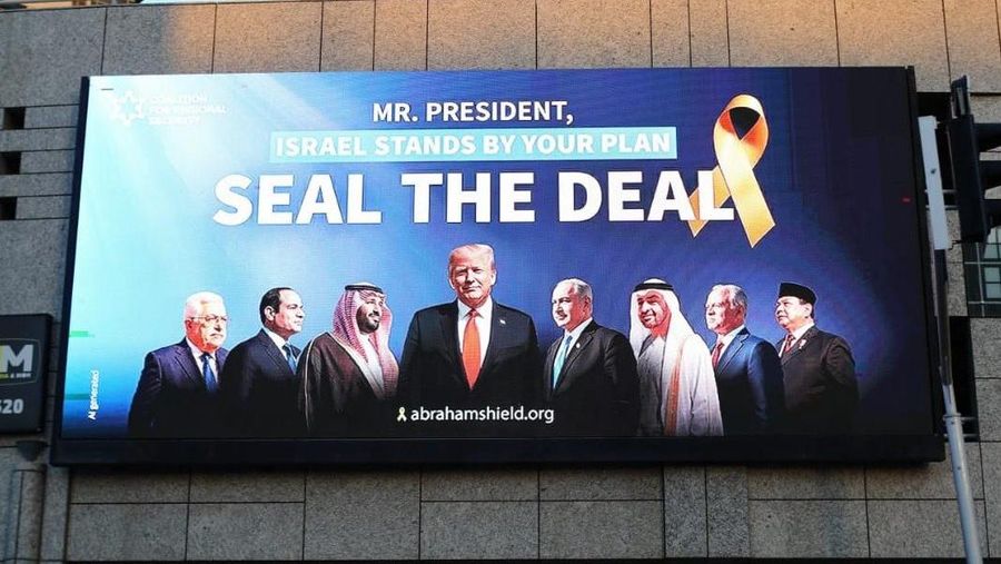 Billboard yang menampilkan Presiden Indonesia Prabowo Subianto bersama para pemimpin AS, Israel dan Arab dipajang di Tel Aviv, Israel. (X/AbrahamShield25)