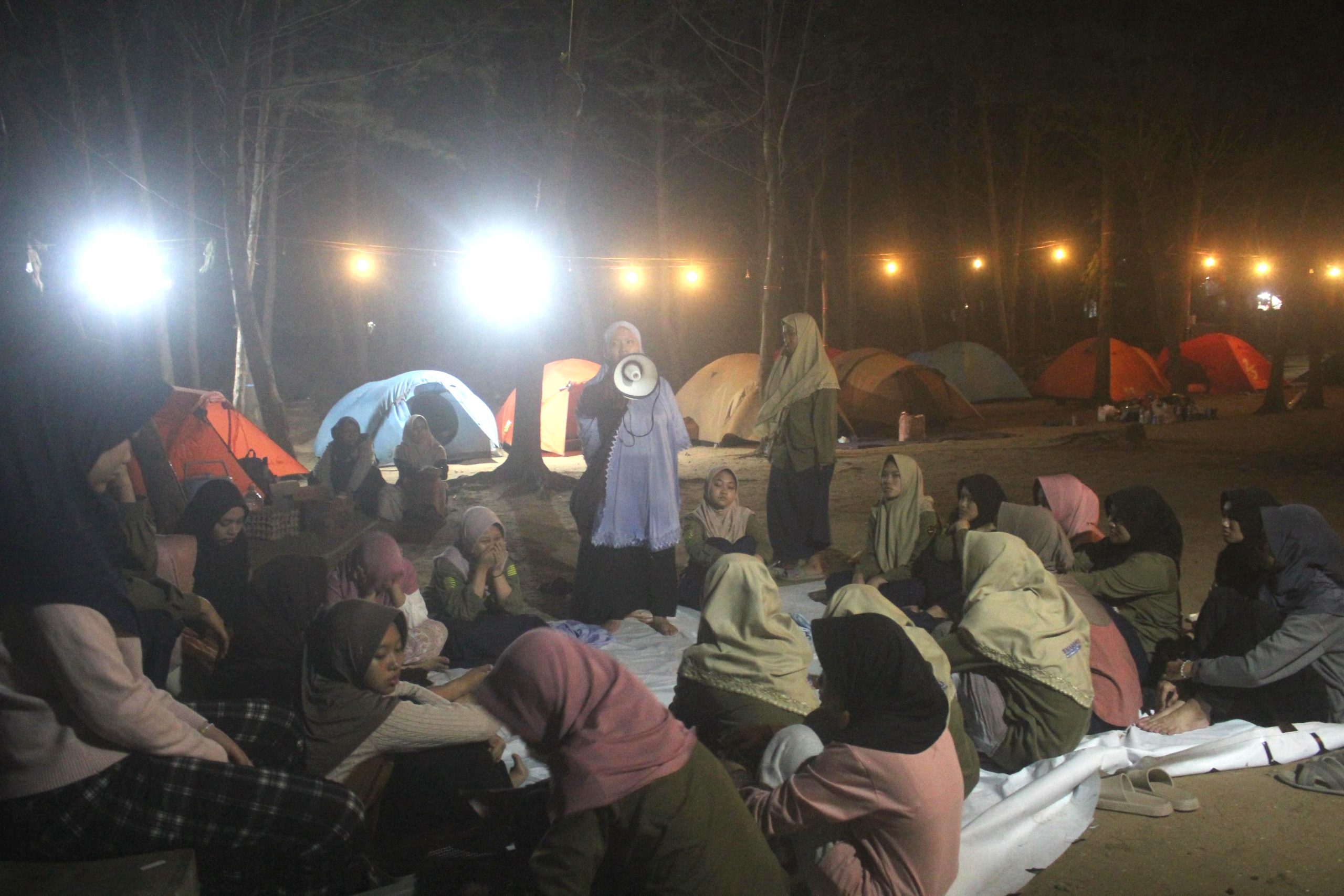 Malam keakraban menjadi momen yang paling dinanti. Di sekeliling api unggun, tawa dan canda pecah. Para santriwati bernyanyi, berbincang, dan saling menguatkan, membangun kelekatan emosional yang menjadi ruh dari kegiatan kamping.