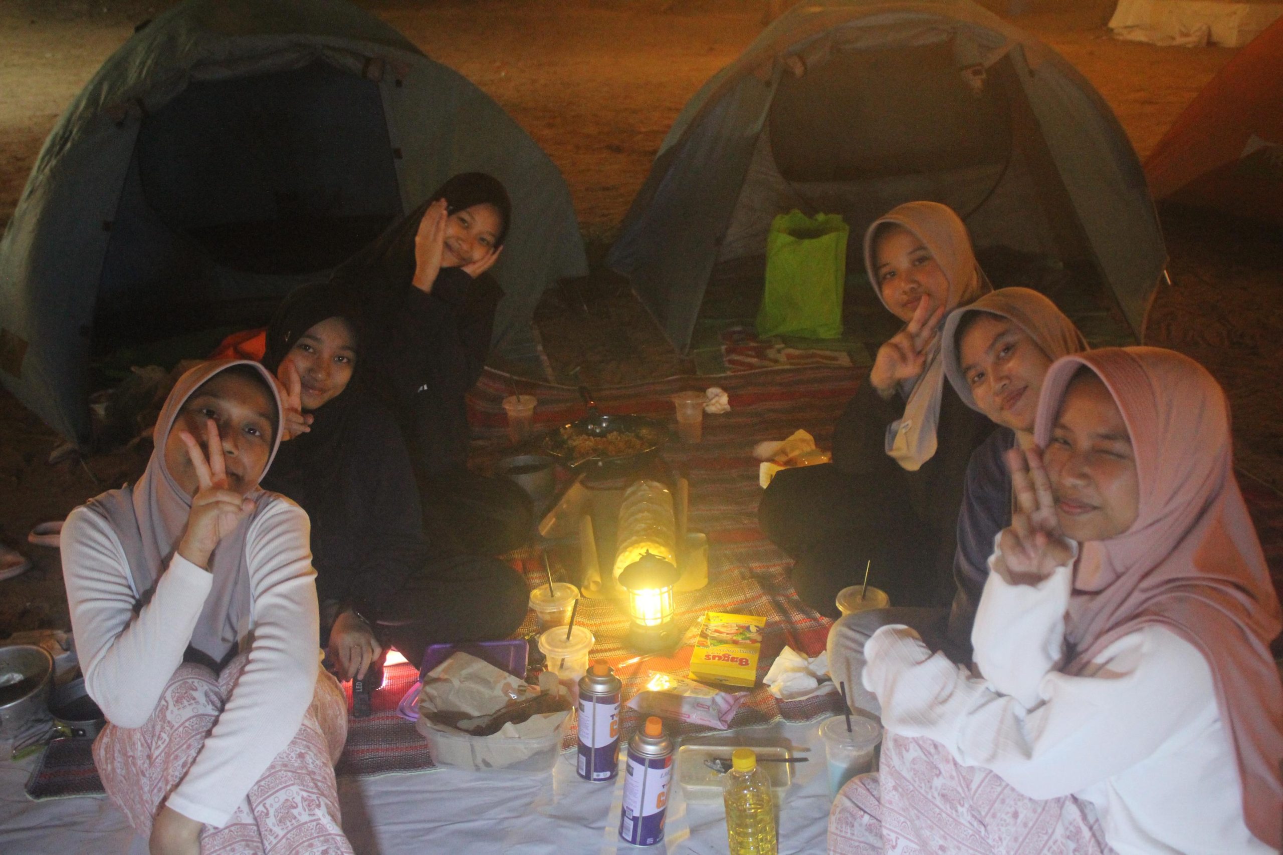 Para santriwati peserta Kamping Ceria MBS Madinatul Ilmi menikmati makan malam di tenda hasil masakan sendiri, di Patai Panduri, Tuban, Jumat (12/12/25) (Tagar.co/Zada Kanza Makhfiya Mohammad)