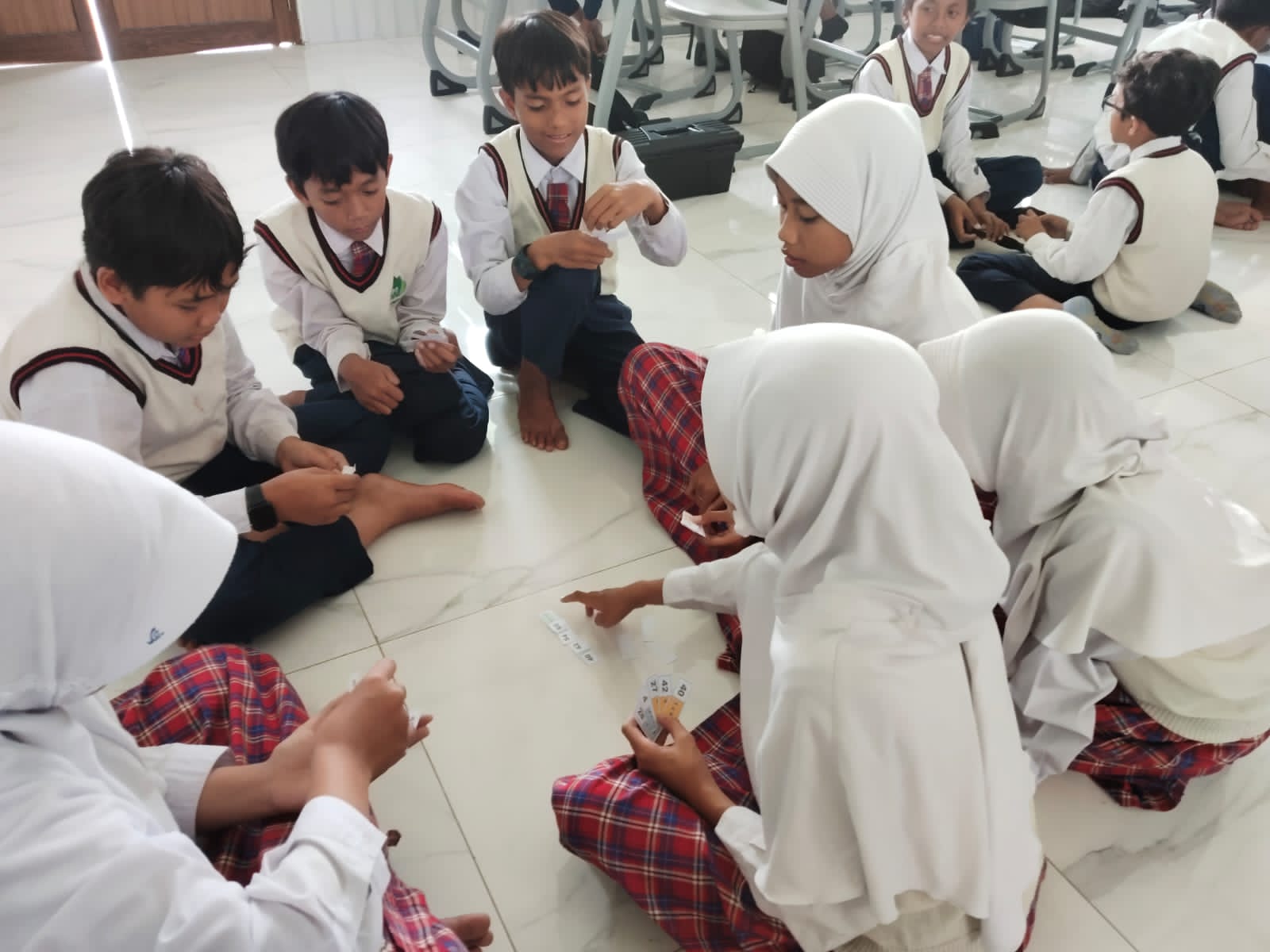 Namun kali ini bukan sekadar waktu santai. Di sela istirahat, mereka larut dalam permainan edukatif yang dikemas seru: Perang Kartu Domino Perkalian Anti Ribet (Dokar).