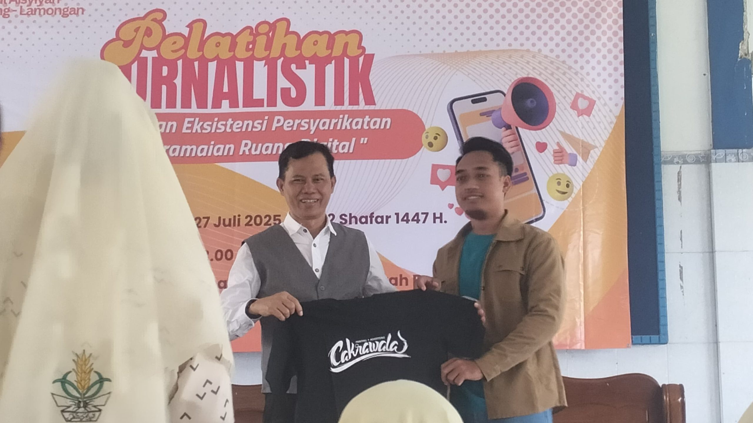 Saat saya tiba, sesi inti pelatihan tengah berlangsung. Mohammad Nurfatoni, Redaktur Tagar.co, berdiri di panggung depan menyampaikan materi dengan penuh semangat. Ia mengenakan kemeja putih panjang dan vest abu-abu, tampil percaya diri dan komunikatif. Gestur tangannya mengiringi setiap kalimat. Di belakangnya, tergantung banner besar bertuliskan “Pelatihan Jurnalistik – Viralkan Eksistensi Persyarikatan di Keramaian Ruang Digital”.