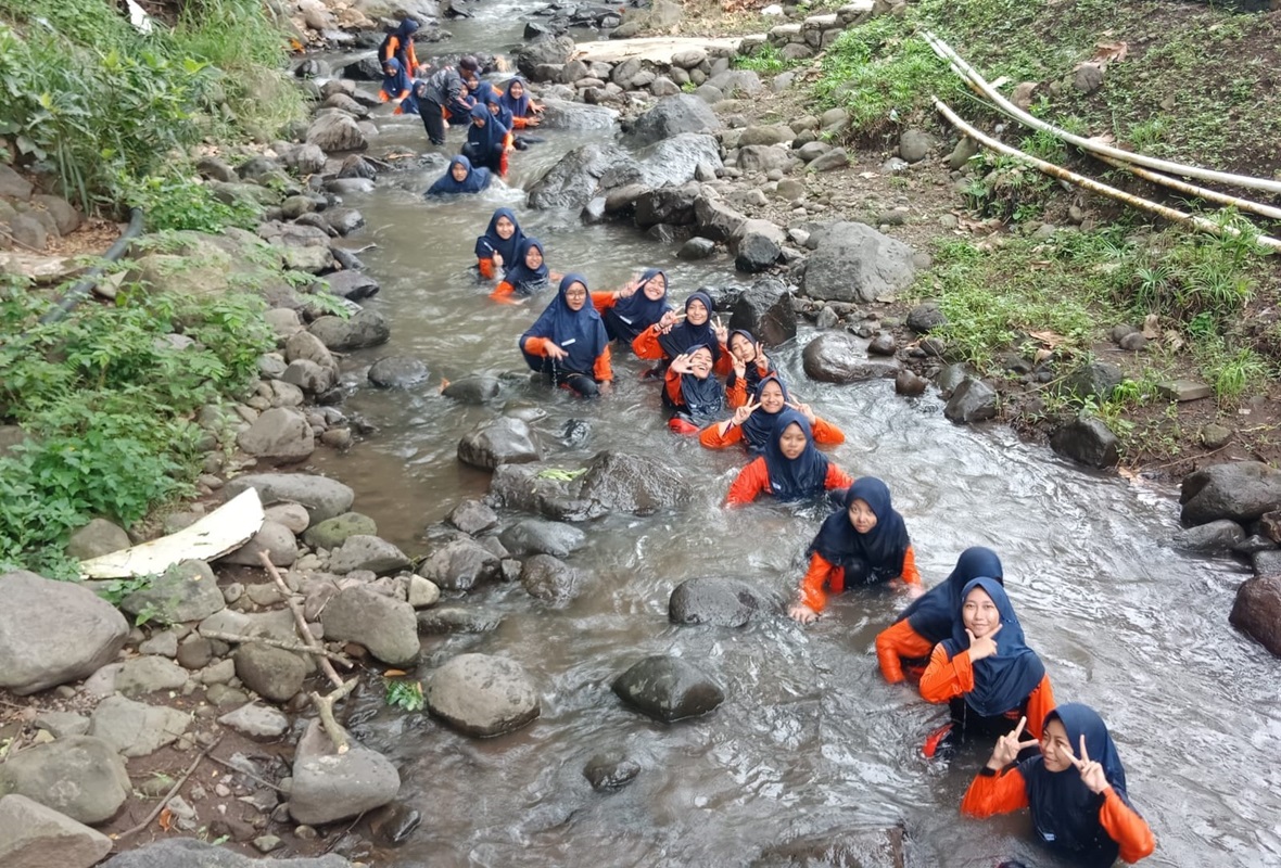 Siswa Spemdalas sedang melaksanakan susur sungai di kegiatan outbound di di Lembah Pendawa, Pandaan, Pasuruan, Senin (10/2/2025). (Ichwan Arif/Tagar.co)