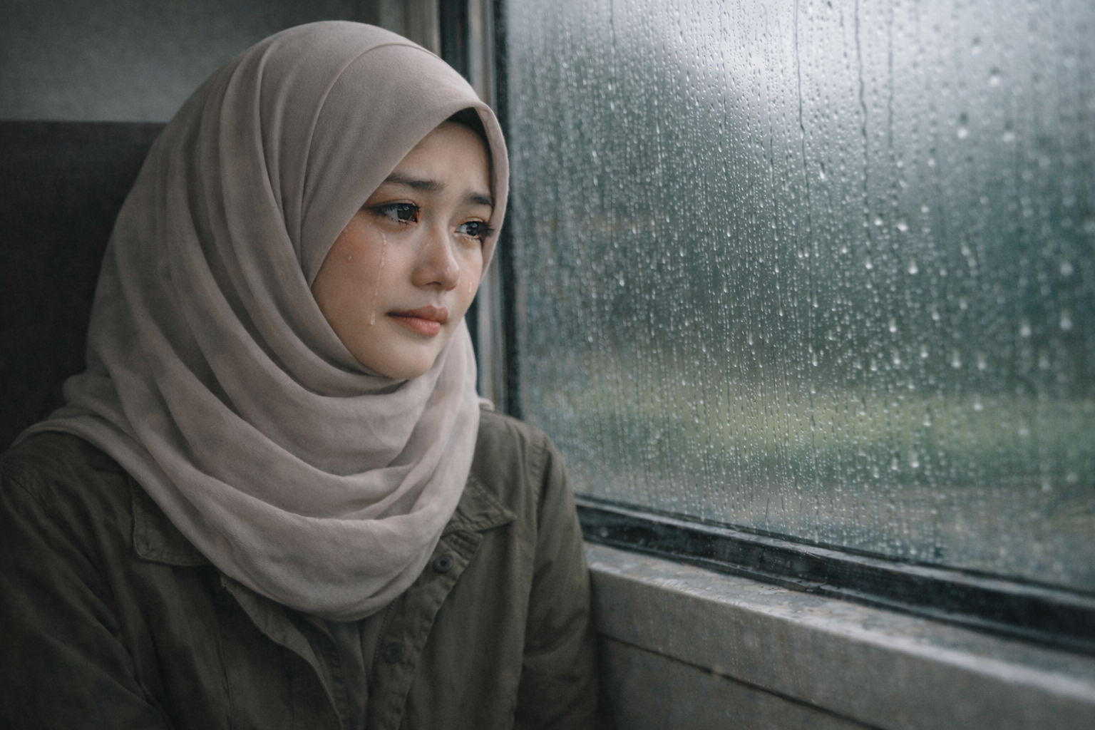 Deru kereta dan hujan menjadi latar lamunannya. Di balik kaca berembun itu, kenangan perlahan muncul.