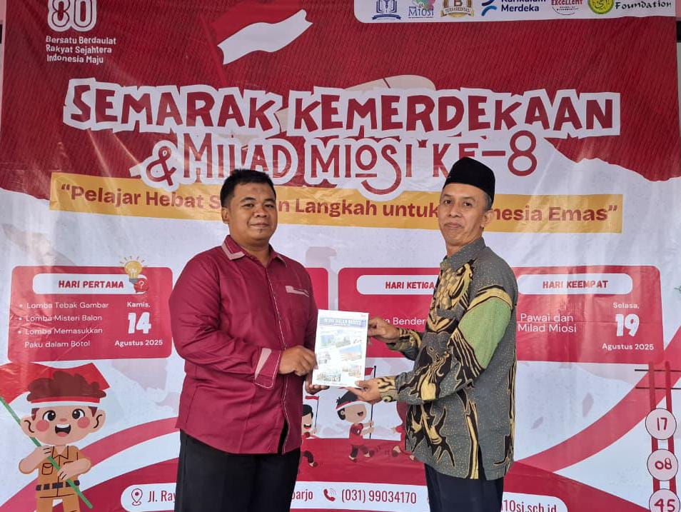 Tagar.co — Buku “Miosi dalam Berita” menjadi kado milad ke-8 SMP Muhammadiyah 10 Sidoarjo (Miosi) yang istimewa. Saya sebagai penulis mempersembahkan buku ini kepada Kepala Miosi, Moch. Muqhir, S.Ag., M.Pd. pada puncak acara Semarak Agustusan dan Milad Miosi ke-8 di halaman sekolah, Selasa, 19 Agustus 2025.