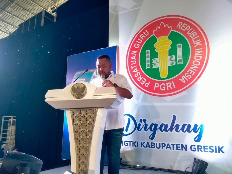 Dengan mengenakan kemeja putih sederhana dan celana blue jeans, Fandi Akhmad Yani—akrab disapa Gus Yani—tampak percaya diri berdiri di podium berhias lambang Garuda. Di belakangnya terpampang logo besar Persatuan Guru Republik Indonesia (PGRI), menegaskan suasana resmi dan penuh khidmat.