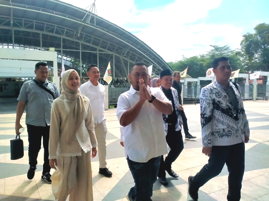 Bupati Gresik, Fandi Akhmad Yani (tengah) sesaat sebelum memasuki gedung Wahana Ekspresi Poesponegoro pada peringatan HUT Ke-75 IGTKI-PGRI di Kabupaten Gresik Jawa Timur, Rabu, 20 Agustus 2025 (Tagar.co/ Nadhirotul Mawaddah).