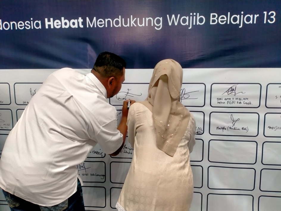 Bupati Gresik, Fandi Akhmad Yani (kiri) bersama dengan Bunda PAUD Gresik menandatangani deklarasi dukungan wajib belajar 13 tahun sebelum memasuki gedung Wahana Ekspresi Poesponegoro pada peringatan HUT Ke-75 IGTKI-PGRI di Kabupaten Gresik Jawa Timur, Rabu, 20 Agustus 2025 (Tagar.co/ Nadhirotul Mawaddah).