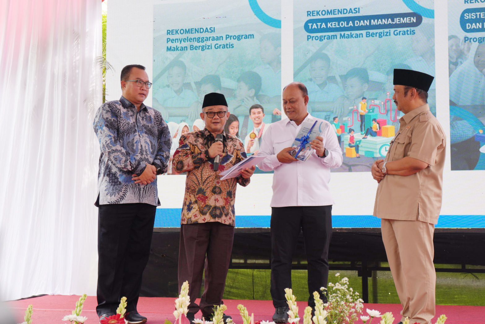 Menteri Pendidikan Dasar dan Menengah (Mendikdasmen), Abdul Mu’ti, bersama Menteri Perencanaan Pembangunan Nasional/Kepala Bappenas, Rachmat Pambudy, secara simbolis menyerahkan Buku Rekomendasi Penyelenggaraan MBG kepada Kepala Badan Gizi Nasional, Dandan Hidayana.