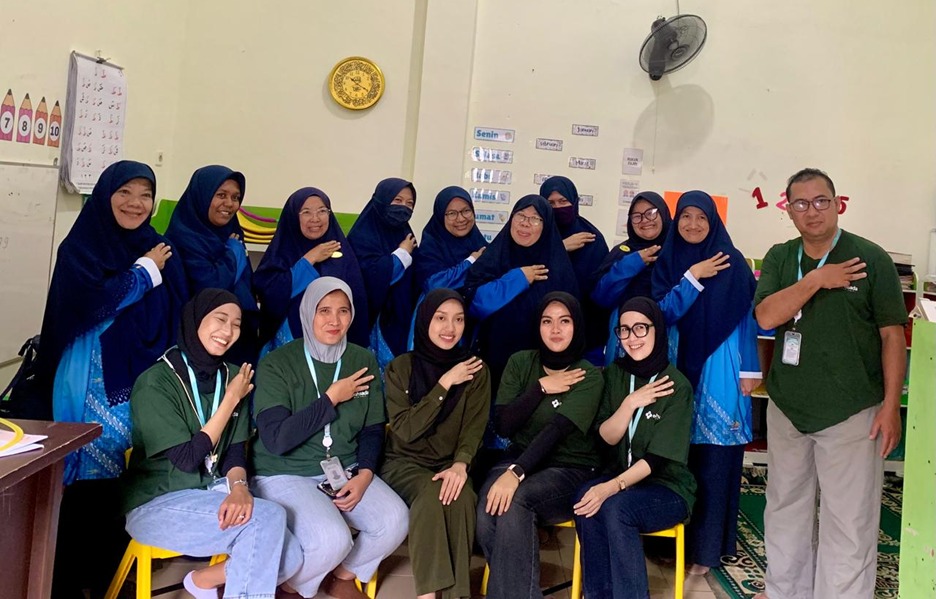“Cuci tangan itu ada enam langkah, teman-teman,” jelas Erlinda. Dengan sabar, ia mengajarkan gerakan cuci tangan sambil bernyanyi. Lirik sederhana membuat anak-anak cepat hafal: