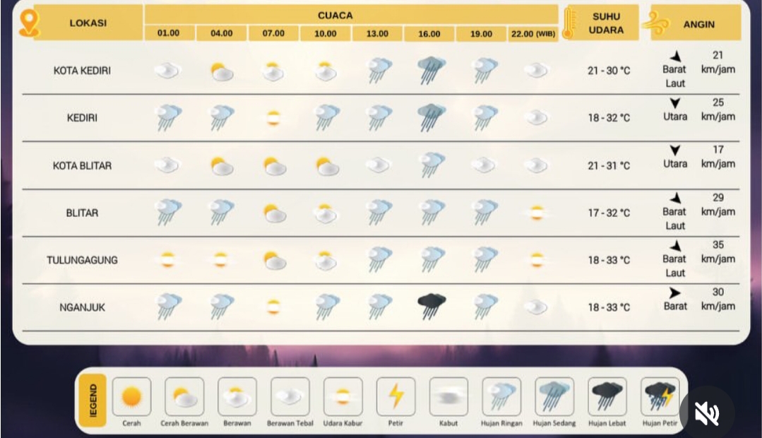Berikut prakiraan cuaca kabupaten dan kota se-Jatim, Rabu 4 Februari 2026: