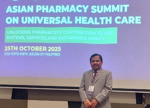 Abdul Rahem, dosen Fakultas Farmasi Universitas Airlangga dan Wakil Ketua Umum PP IAI, berfoto usai menjadi peserta Asian Pharmacy Summit on Universal Health Care di Seda Vertis North, Quezon City, Filipina, Sabtu (25/10/2025).
