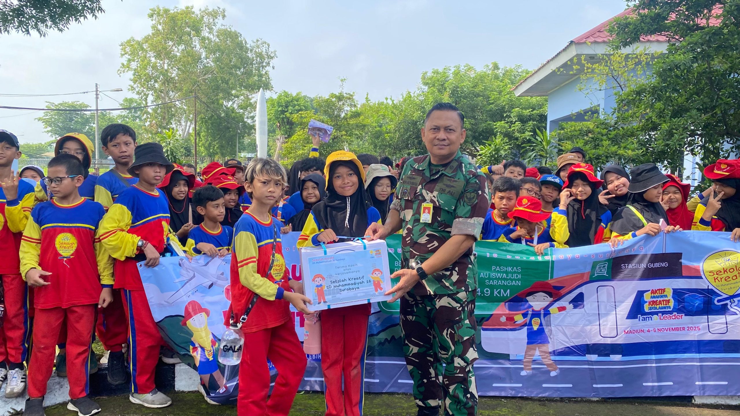 Peserta Outbound Learning siswa kelas 5 Sekolah Kreatif Baratajaya menyerahkan cinderamata kepada perwakilan TNI AU di Lanud Iswahyudi Madiun,Rabu (5/11/2025) (Tagar.co/Agus Mulyadi
