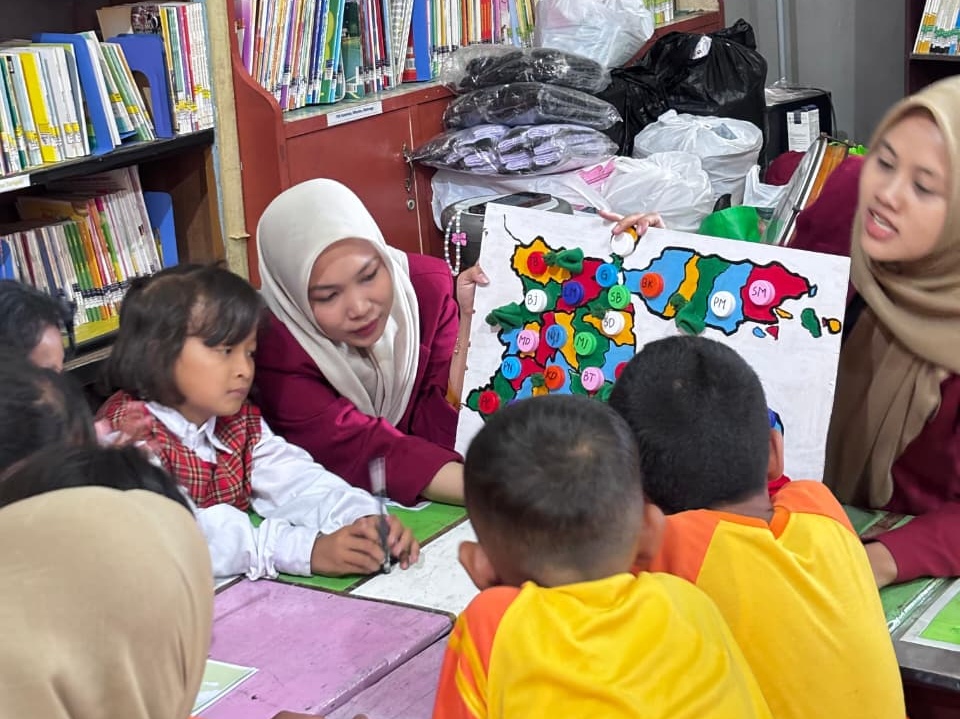 Seorang mahasiswa Universitas Muhammadiyah Malang (UMM) dengan sabar menunjuk simbol-simbol di atas peta, sementara anak-anak mencoba menebak nama kota yang ditandai. Suasana belajar terasa akrab, hangat, sekaligus penuh semangat.
