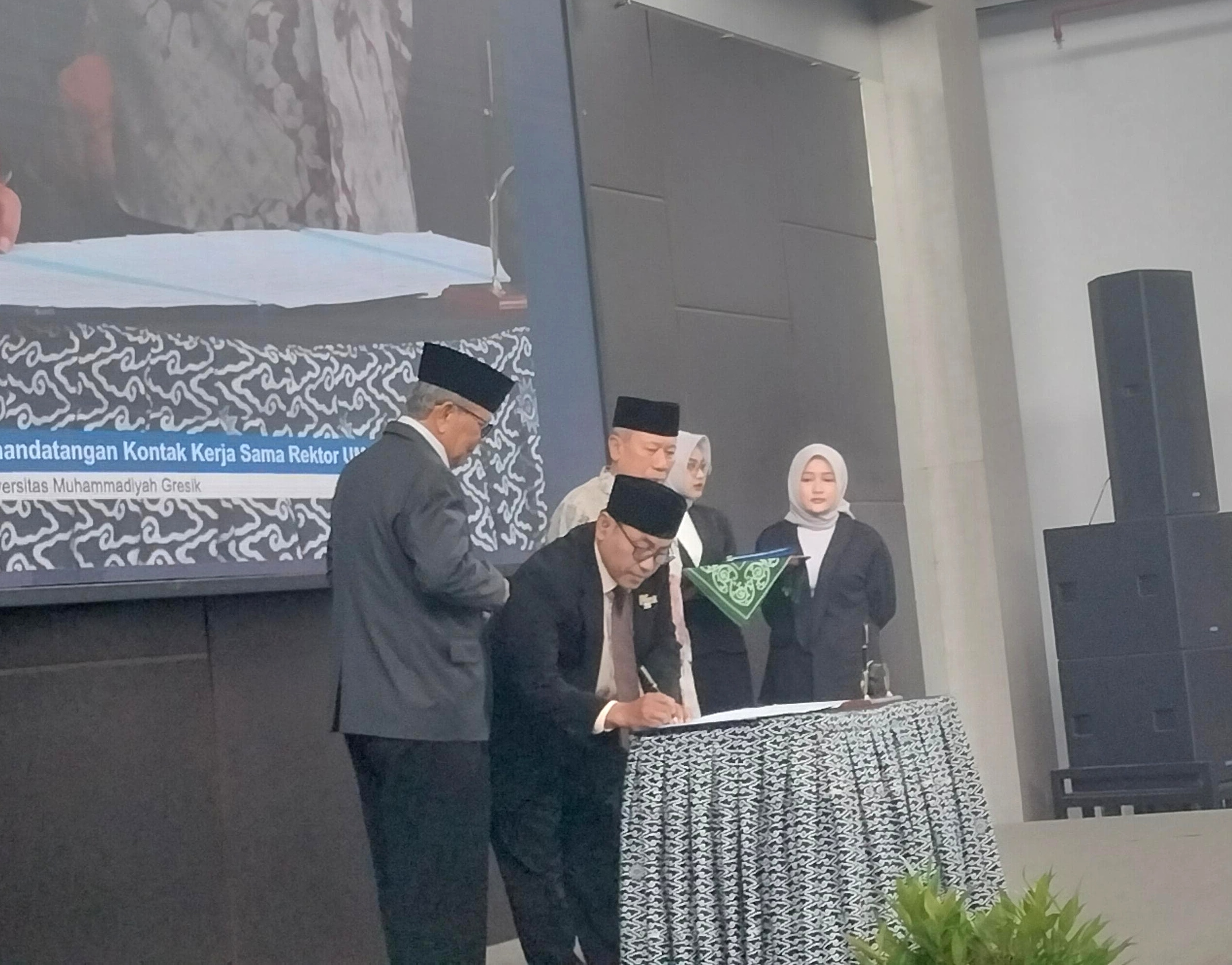 Tak lama kemudian, Prof. Khoirul menandatangani Naskah Pelantikan dan Pakta Integritas. Gemuruh tepuk tangan kembali mengalir. Usai sesi foto bersama, rektor baru tetap berdiri di panggung, bersiap menerima estafet kepemimpinan secara simbolis.