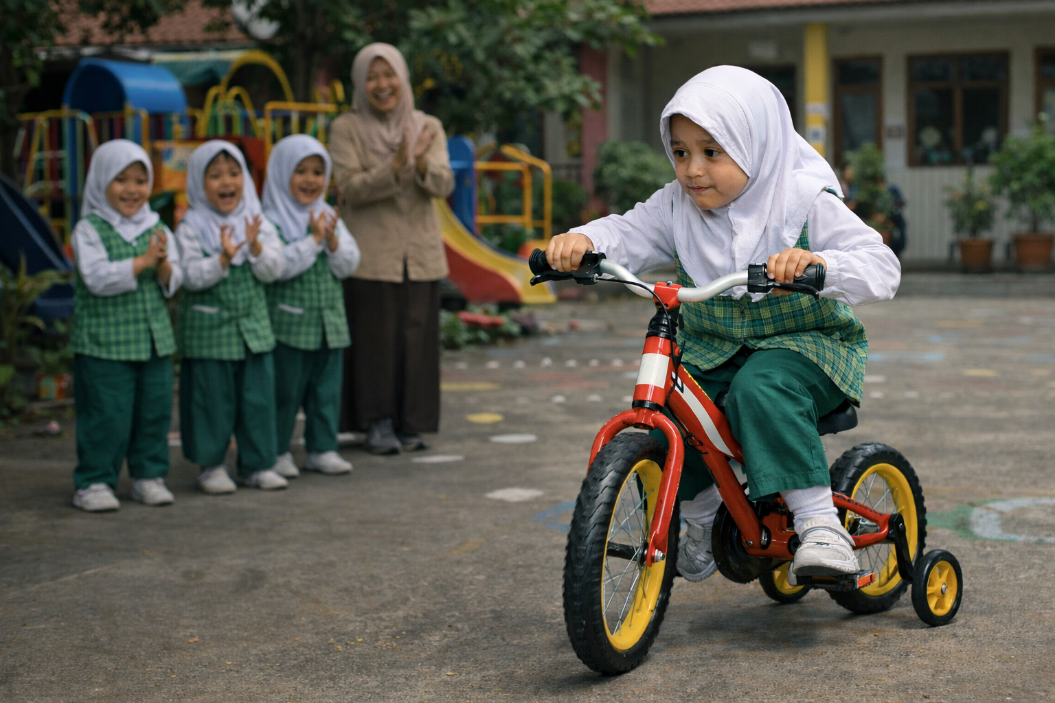 Dengan dorongan kecil dari teman-temannya, Fania akhirnya duduk di atas sepeda. Kayuhannya pelan dan belum seimbang. Namun, ada sesuatu yang berbeda di wajahnya—lega, sekaligus bangga.
