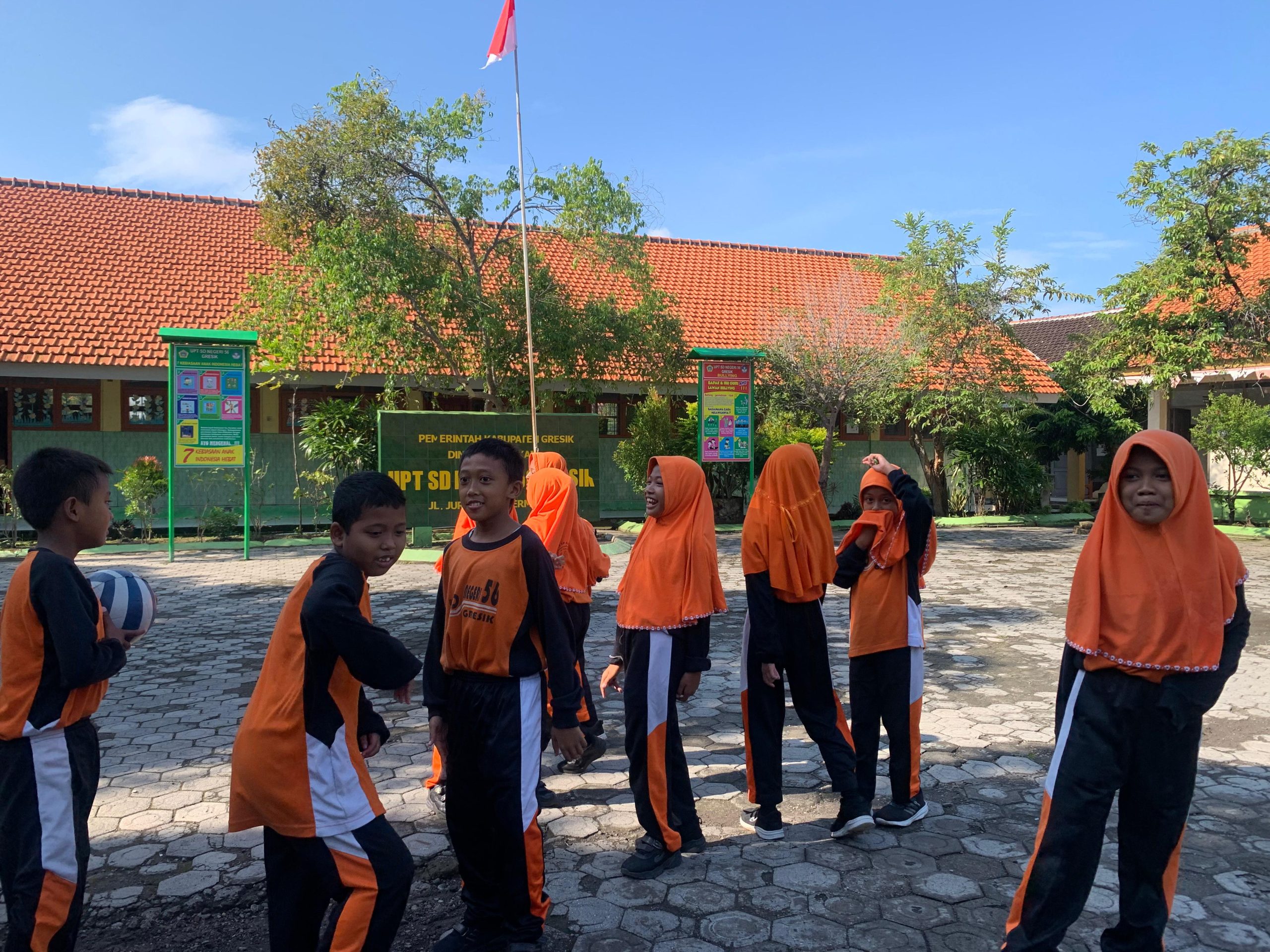 Siswa UPT SDN 56 Gresik mengikuti aktivitas luar kelas dengan penuh keceriaan di halaman sekolah, Jumat (6/2/2026), sebagai bagian dari rangkaian Gerakan Advokasi Mengajar (GAM) PR IPM SMA Muhammadiyah 1 Gresik. (Tagar.co/Zada Kanza Makhfiya Mohammad)
