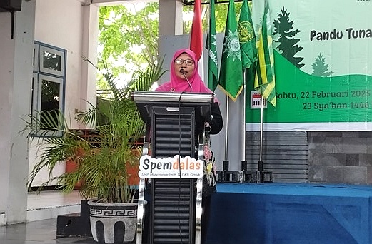 Ketua Majelis PAUD Dasmen Pimpinan Daerah Aisyiyah (PDA) kabupaten Gresik, Musyrifah, S. Pd saat memberikan sambutan pada kegiatan Orientasi Pandu Tunas Athfal di SMP 12 (Spemdalas) GKB Gresik, Jawa Timur, 22 Februari 2025 (Tagar.co/Rahma Yulia Isnaini)
