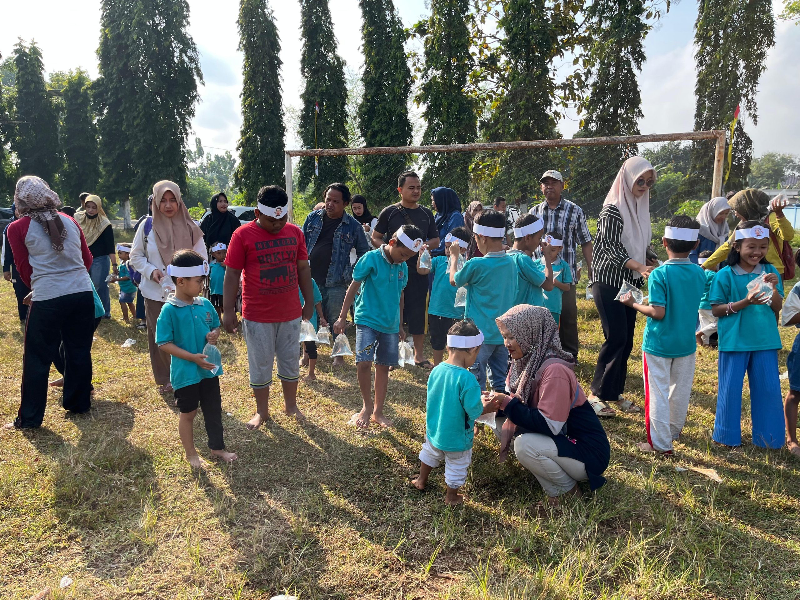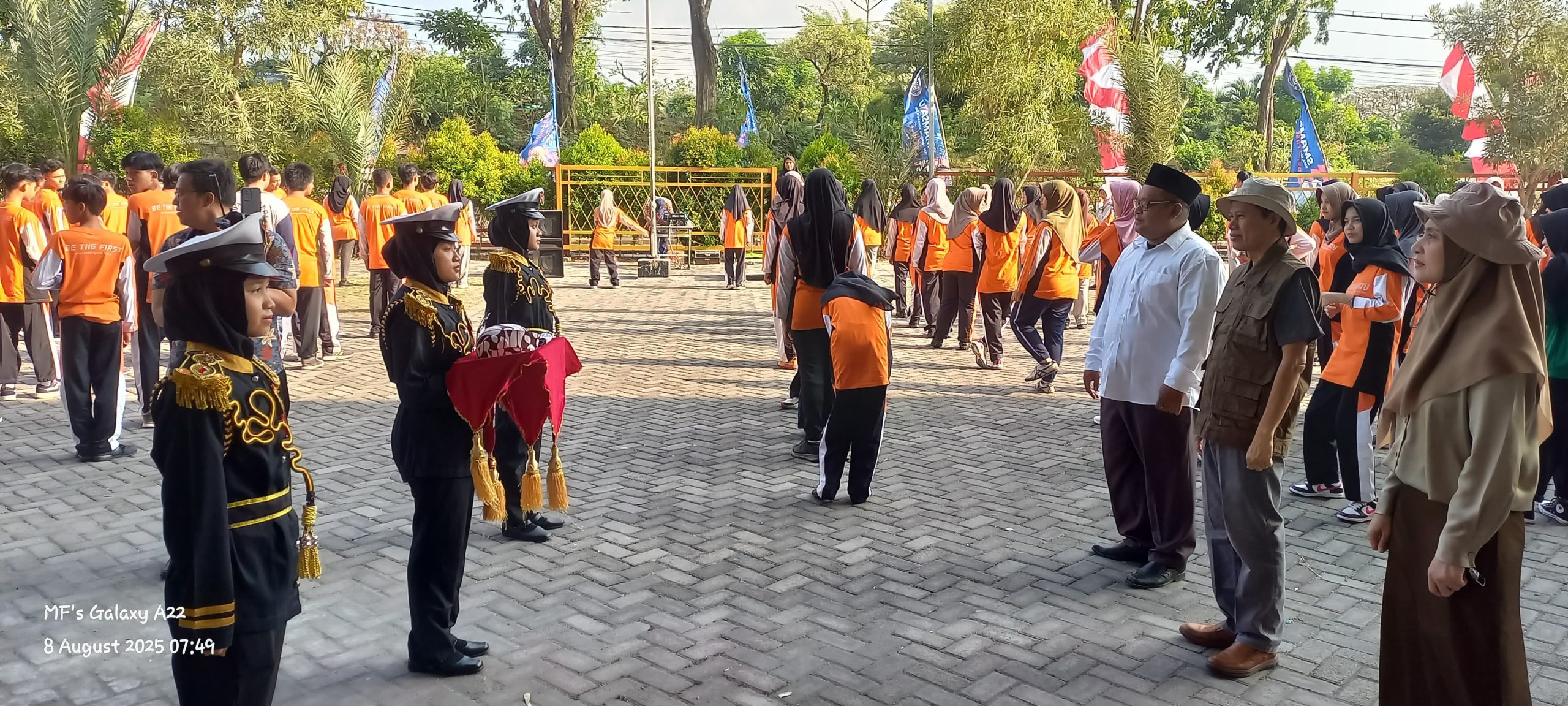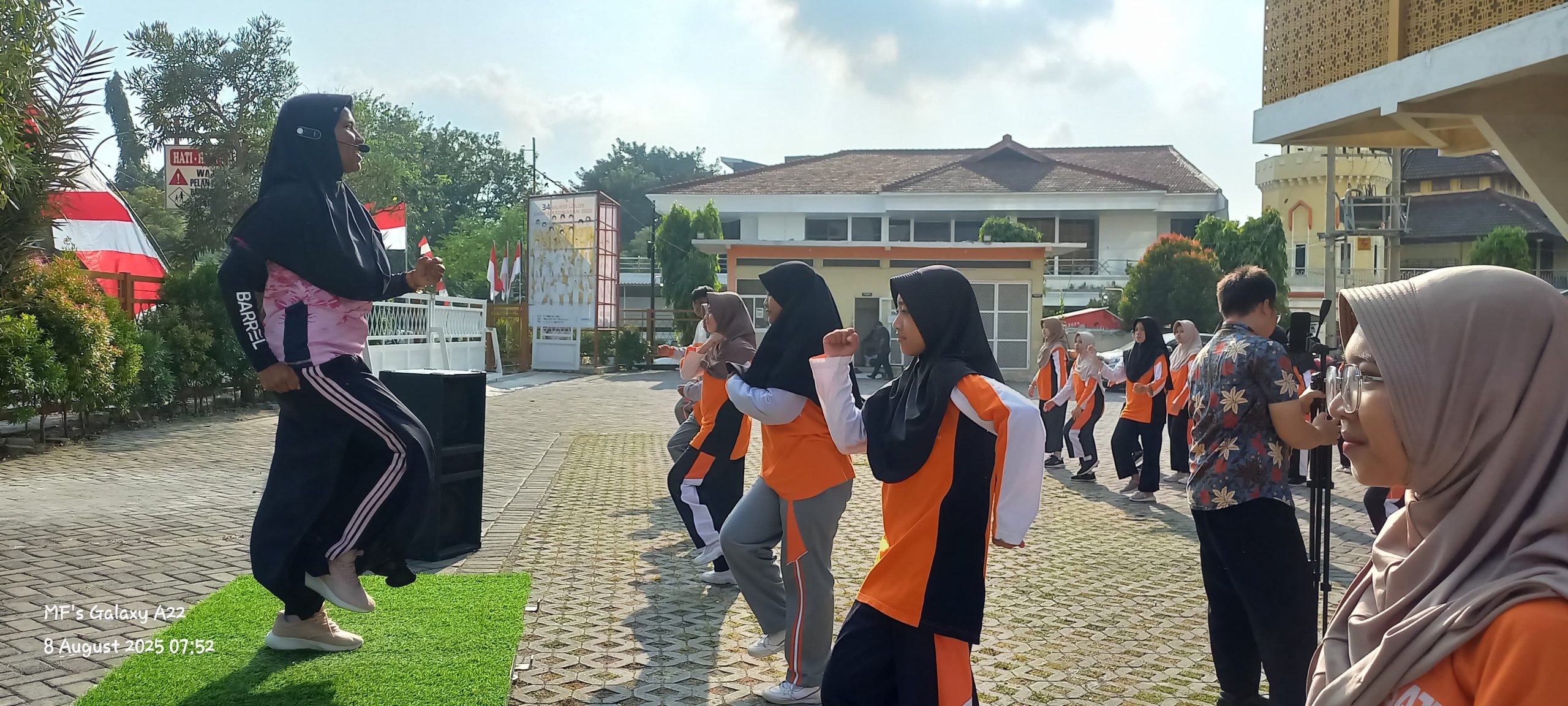 Iringan musik riang membuat halaman sekolah penuh energi. Pimpinan sekolah, guru, dan siswa berseragam oranye-hitam bergerak serempak, sementara sinar matahari pagi memantulkan keceriaan dari wajah-wajah yang tersenyum lepas.