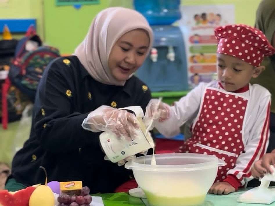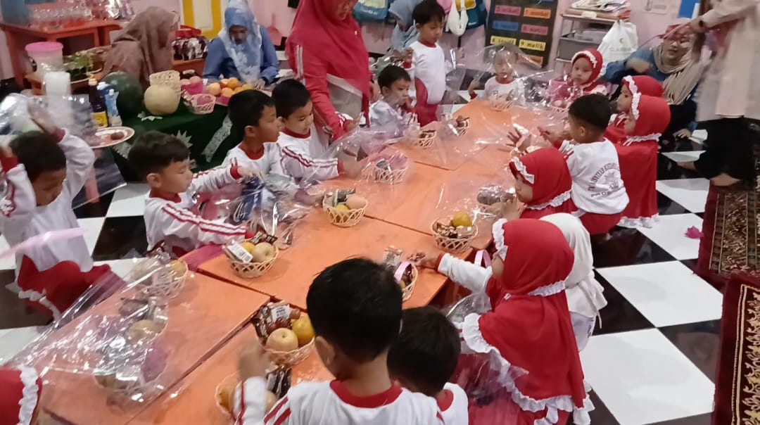 Di kelas A1, suasana riuh penuh antusias. Wali murid Defi Rizki Amalia menjadi “guru sehari” yang memandu anak-anak membuat parsel dan minuman es buah. Mereka dengan cekatan menata apel, jeruk, anggur, susu, dan kue cokelat dalam wadah, lalu membungkusnya dengan plastik bening. Hasilnya, parsel buah berwarna-warni siap dibawa pulang.