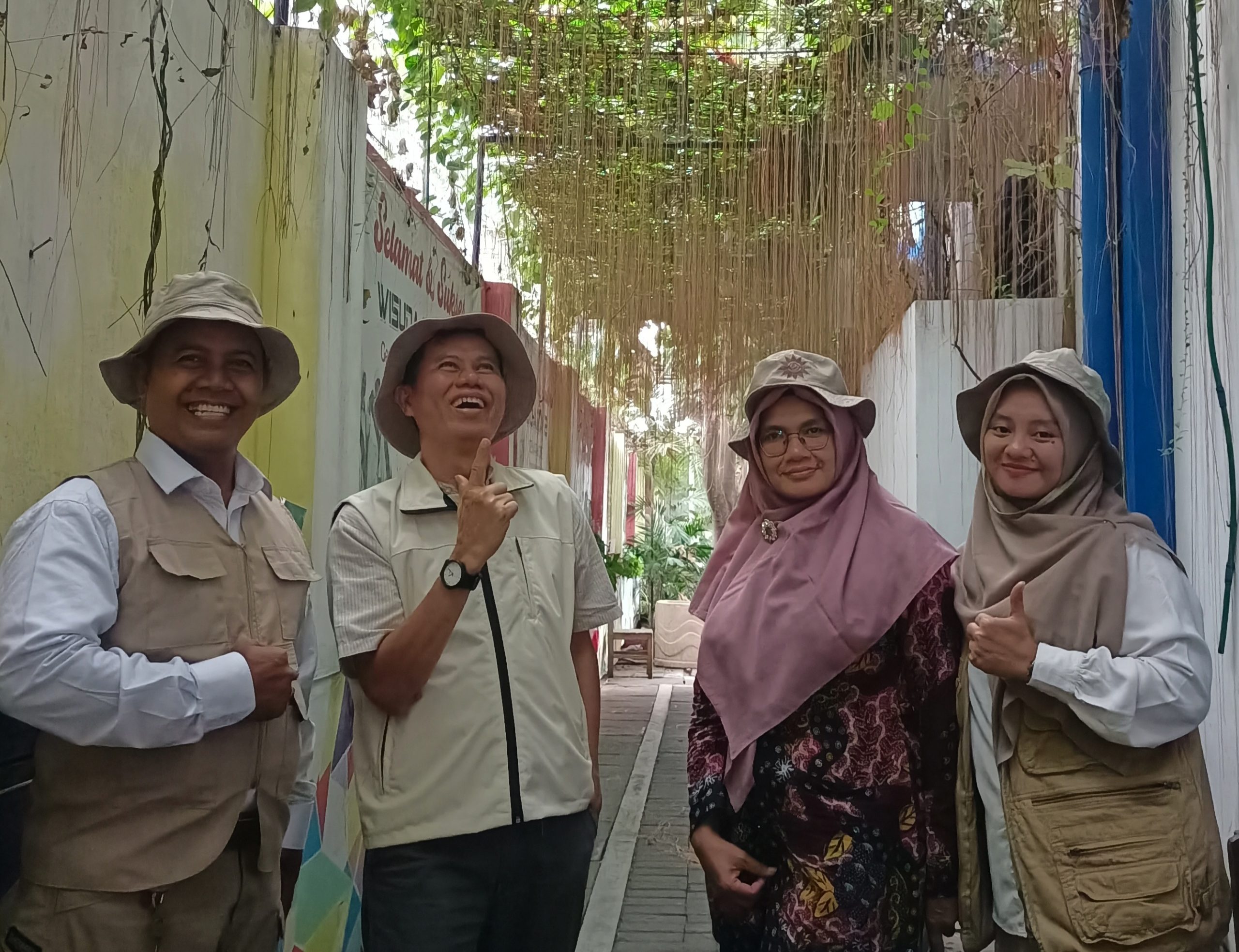Mereka mengenakan topi lapangan dan rompi berwarna cerah—menandakan semangat kegiatan luar ruang yang edukatif sekaligus ramah lingkungan. Yang mengejutkan, outfit mereka ternyata selaras dengan kostum yang kami kenakan.