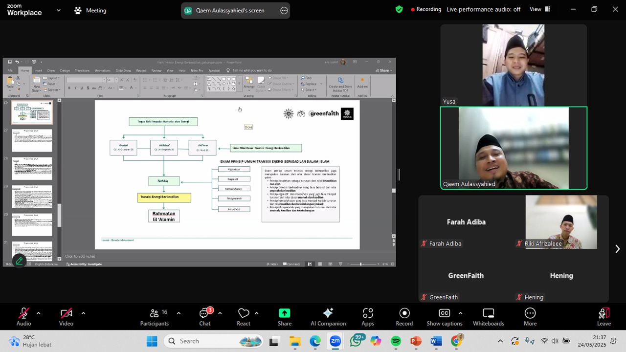 Dalam diskusi, benang merah yang muncul adalah soal keadilan. Transisi energi yang berkeadilan berarti memastikan tidak ada pihak yang dirugikan—baik secara sosial, ekonomi, gender, maupun ekologis. Konsep ini sejatinya senapas dengan ajaran Islam yang memandang manusia sebagai khalifah Allah (istikhlaf) dan pemakmur bumi (isti’mar), sekaligus pelaku ibadah yang merangkul alam sebagai bagian dari penghambaan kepada-Nya.