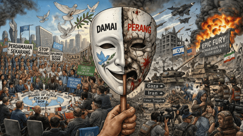 Peristiwa ini sungguh terjadi saat ini. Jalur Gaza yang mengalami peperangan diupayakan damai melalui skema BoP (Board of Peace) dengan melibatkan beberapa negara. Tidak lama setelah deklarasi BoP, terjadi penyerangan Israel–AS ke Iran dengan slogan Epic Fury (kemarahan yang luar biasa).