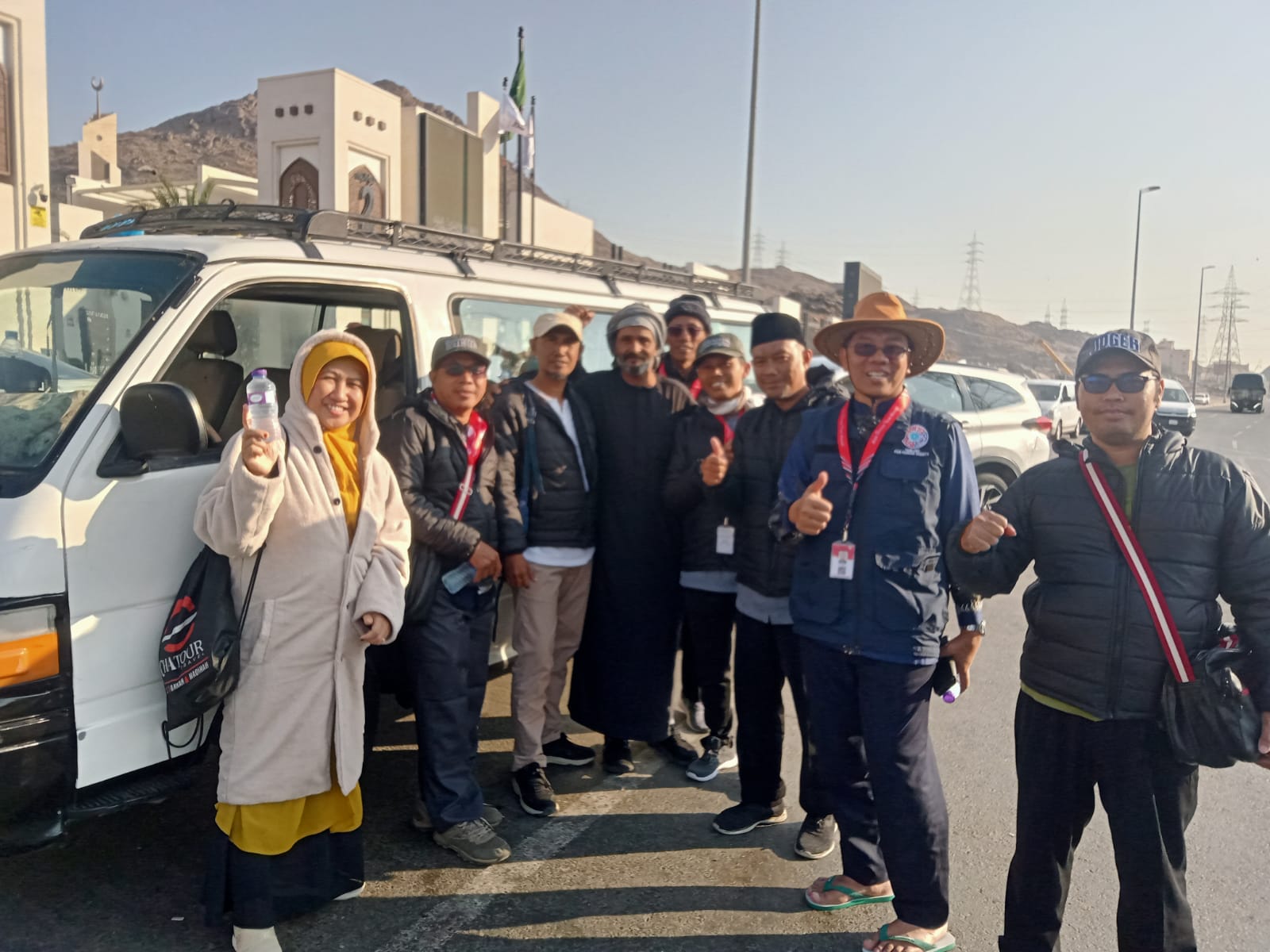 Dengan taksi tua rasa Mercy, sopir Ibrahim (tengah) mengantar sembilan orang berangkat berpetualang mendaki Jabal Nur (Gunung Cahaya), sekitar 10 kilometer dari Kota Makkah, Rabu, 21 Januari 2026 (Tagar.co/Ainun Najib)