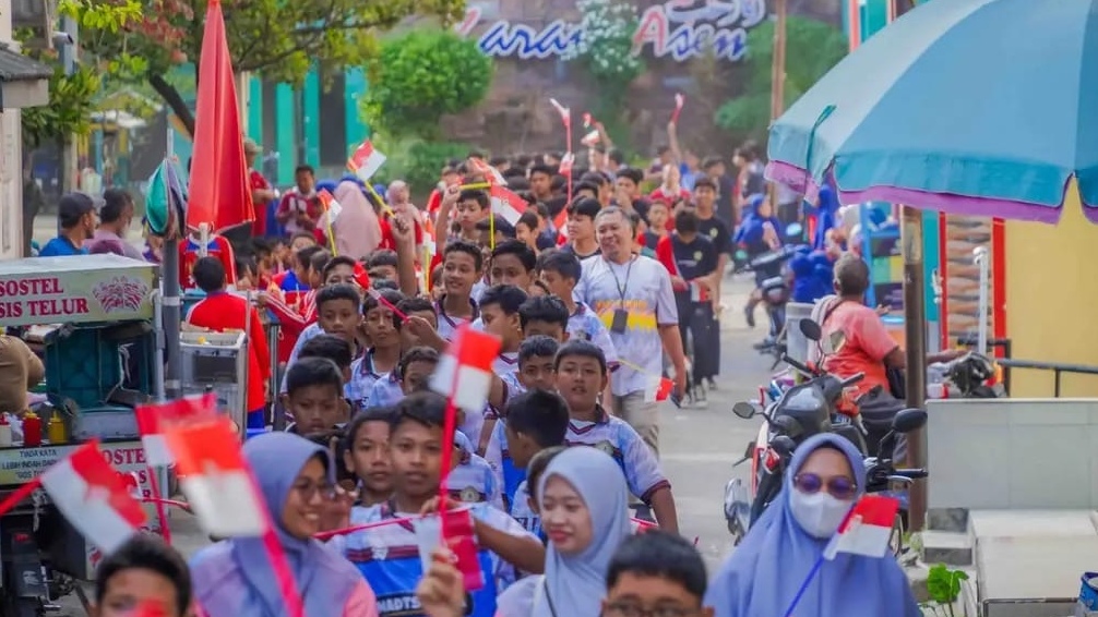 Semangat nasionalisme tampak jelas dari tawa, sorak, dan kibaran bendera yang menyertai langkah mereka. (#)