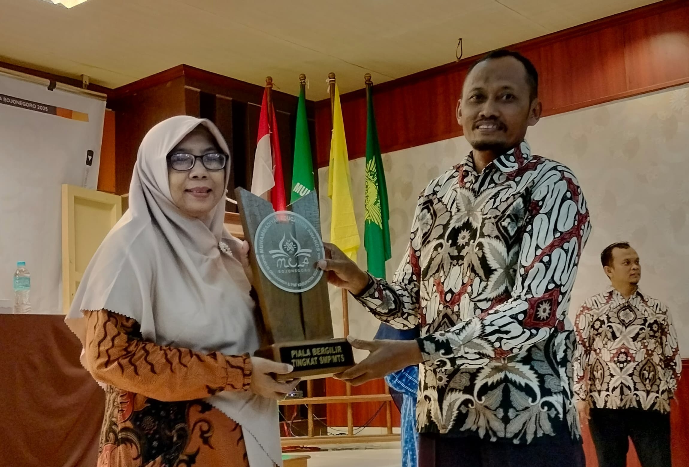 Kepala MTs Muga Sumberrejo Hj. Khoerul Isnaini, S.Pd saat menerima piala bergilir sebagai Juara Umum MEA dari Ketua Majelis Dikdasmen dan PNF PDM Bojnegoro Mustajid, S.Pd , Jum’at (4/7/2025) (Tagar.co/Machmud Shofi)