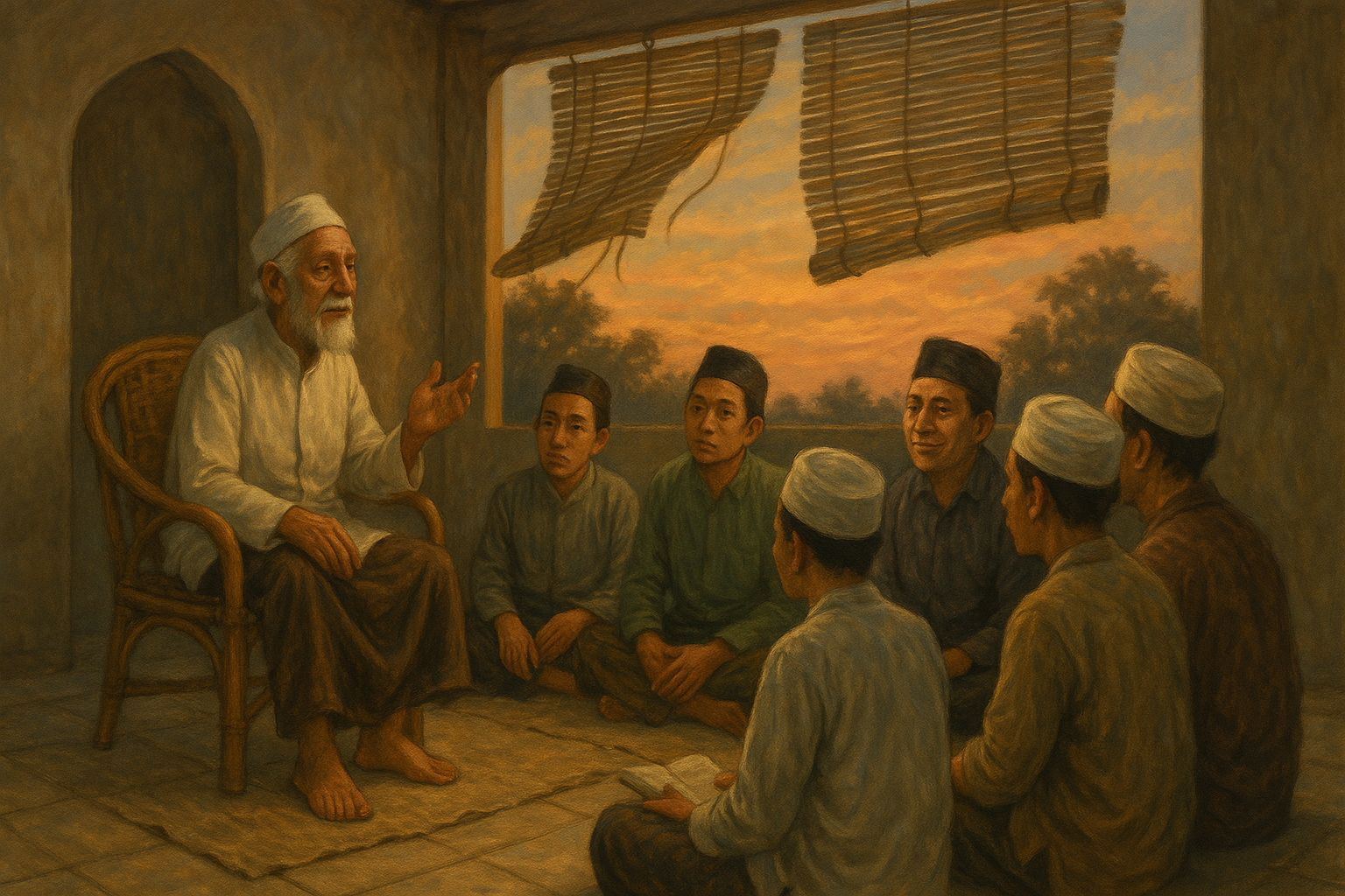 Sore itu, Ustaz Harun duduk di kursi rotan tua, dikelilingi para jemaah yang duduk bersila. Topik pengajian tak jauh dari nasihat tentang ilmu dan kerendahan hati.