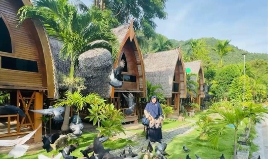 Penulis dengan latar belakang bangunan tradisional dan taman di dalam area museum. Tampak burung-burung merpati yang terbang ketika ada pengunjung yang melewatinya. (Tagar.co/Kholis Ernawati)