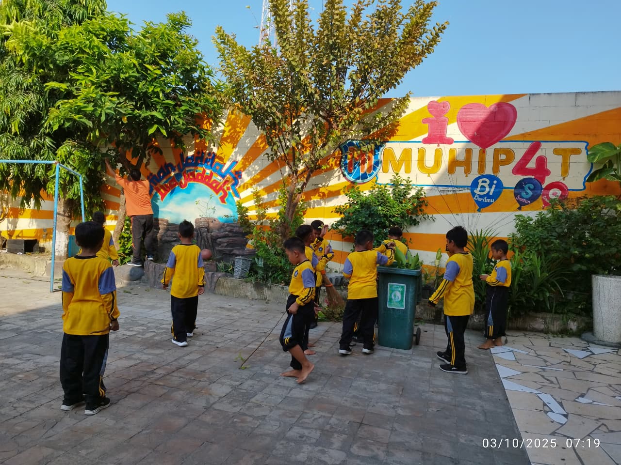Setiap anak terlihat antusias menjalankan tugasnya. Ada yang membersihkan jendela kelas, ada pula yang mengumpulkan dedaunan kering ke tempat sampah hijau di tengah halaman.
