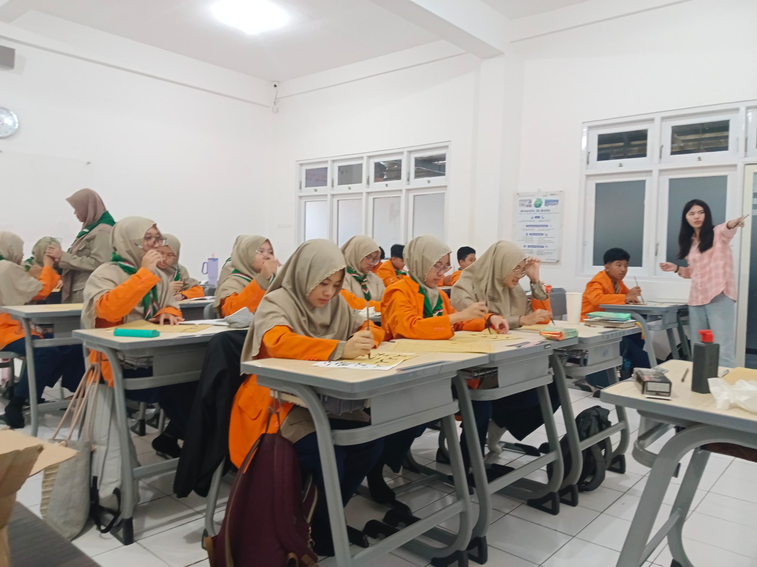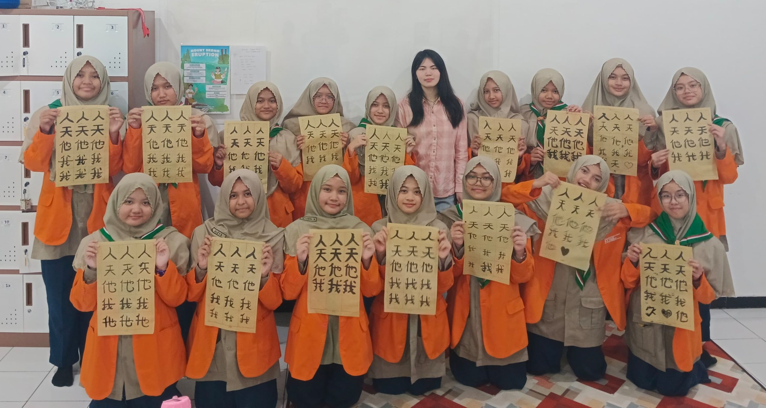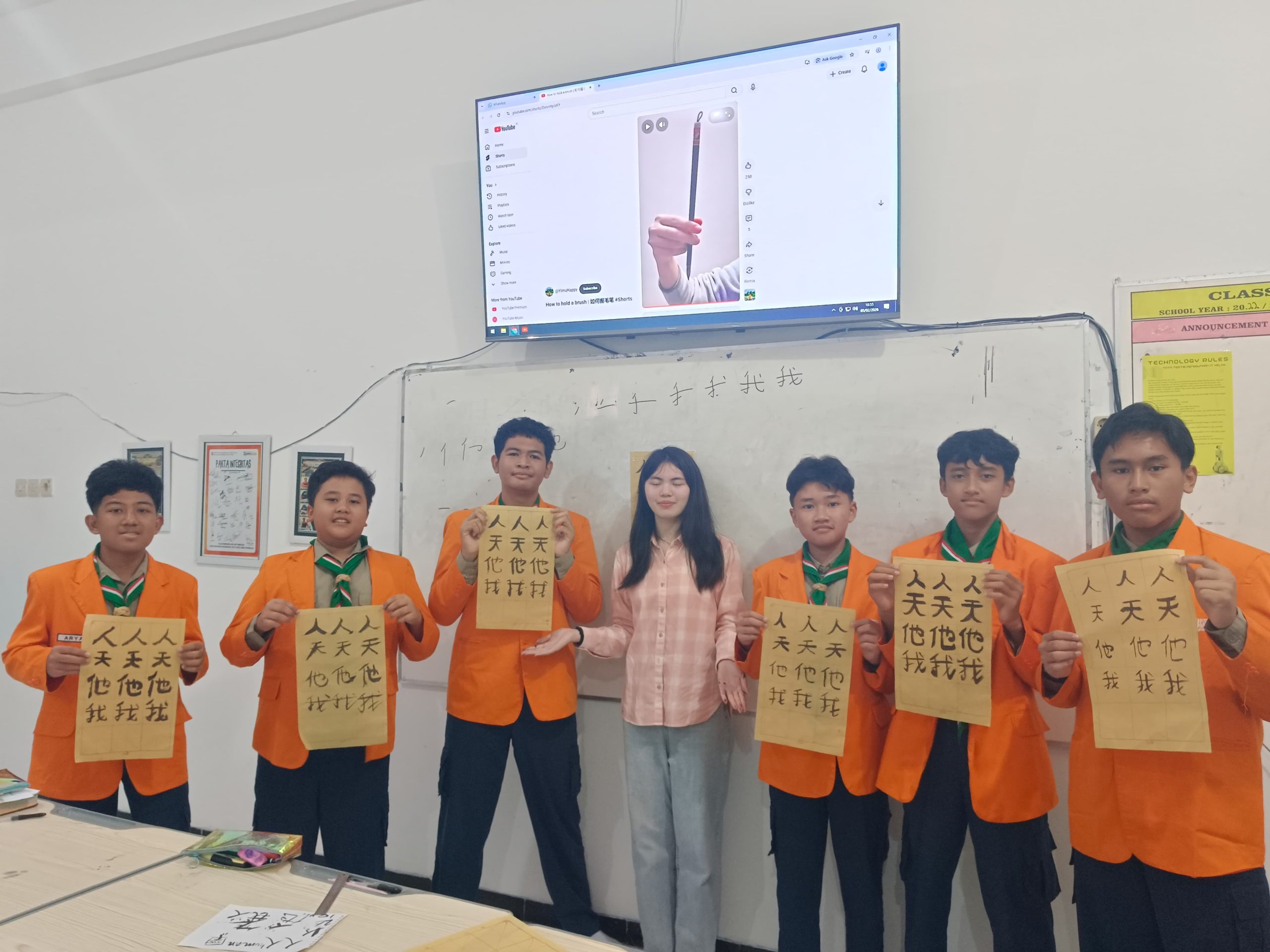 Pembelajaran Bahasa dan Budaya Mandarin pagi itu berlangsung dalam format praktik menulis shufa, seni kaligrafi Mandarin. Kegiatan ini merupakan kolaborasi antara guru Bahasa Mandarin sekolah, Amalia Syavira—yang akrab disapa Li Laoshi—dan guru tamu dari Hangzhou, Chenyang Lou atau Lily Laoshi.