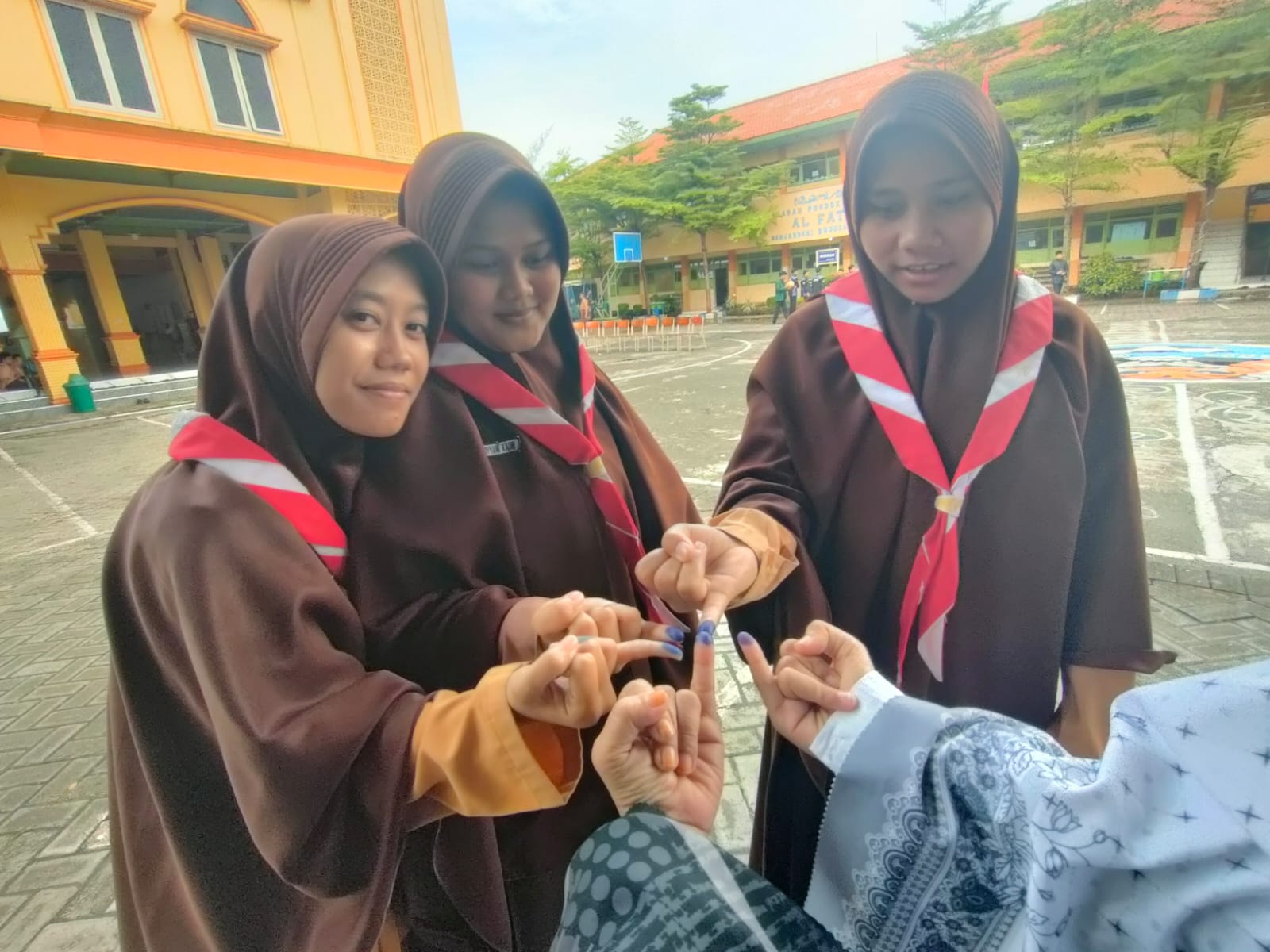 Setelah mencoblos, setiap pemilih mencelupkan jari ke tinta biru—tanda telah menyalurkan hak suara. Proses berjalan tertib dan lancar, mencerminkan kedewasaan berdemokrasi yang tumbuh di lingkungan pesantren.