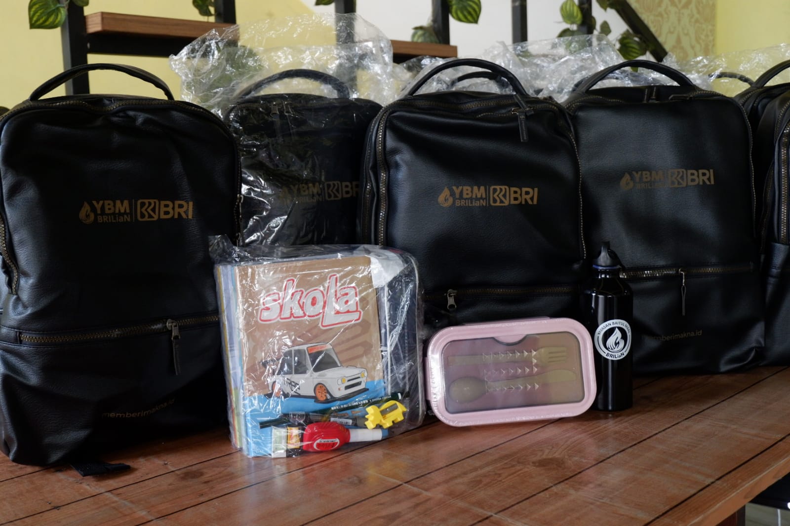 Paket school kit berupa tas, alat tulis, tempat makan, dan tumbler dari YBM BRI yang disalurkan untuk anak asuh Lazismu Gresik. (Tagar.co/Lu’luatul Usroh)