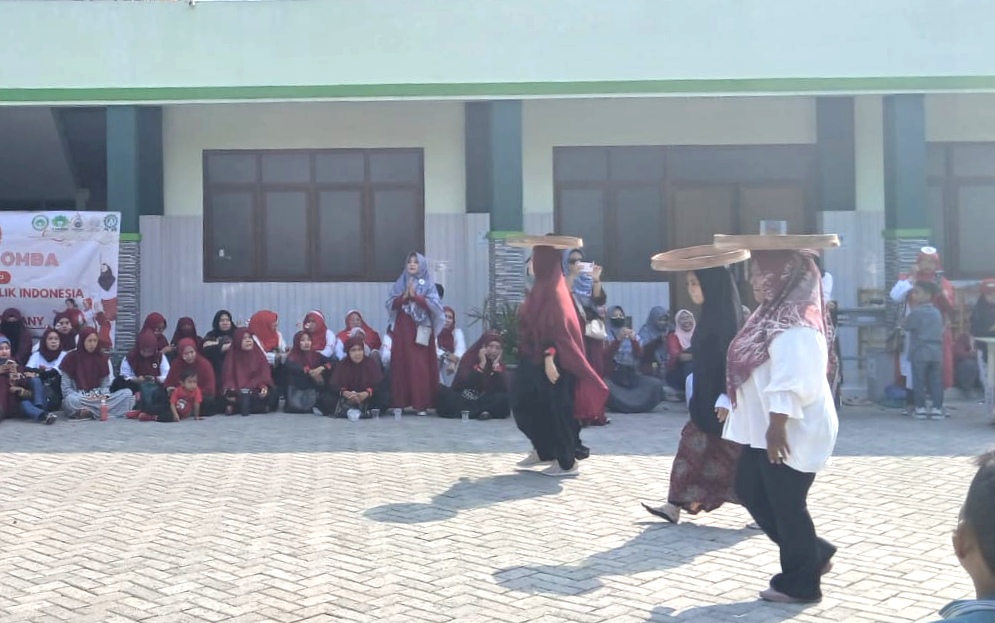Dengan langkah mantap namun hati-hati, mereka berjalan menyusuri halaman sekolah yang lapang, berusaha menjaga agar tempeh tidak goyah. Sorak dan teriakan semangat dari barisan penonton—yang sebagian besar duduk bersila di pinggir halaman—membuat suasana semakin meriah.