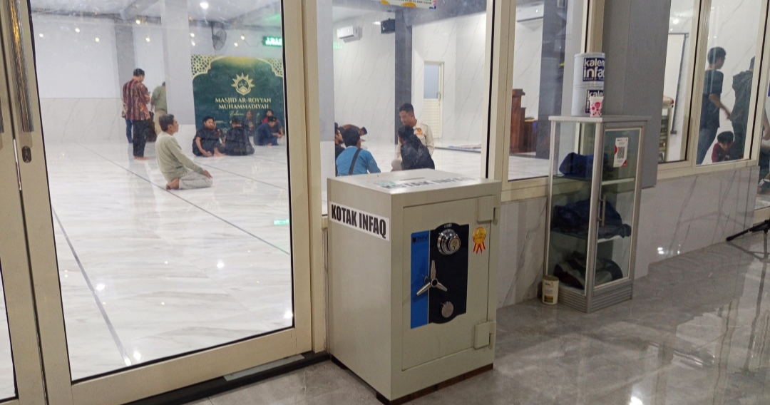 Sambil menikmati teh panas, pandangan tiba-tiba merasa aneh melihat fasilitas lainnya. Seumur-umur belum pernah melihat barang ini di masjid manapun. Kotak infaknya unik. Brankas. Satu brankas di dekat pintu masuk depan, dan satu brankas di dekat pintu masuk utara.