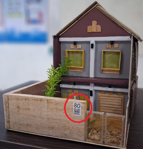 Tidak berhenti di situ, guru menempelkan tiga barcode yang berisi informasi pelengkap: biodata pemilik rumah, jenis ikan di kolam, dan daftar karya dalam galeri lukisan di lantai dua.