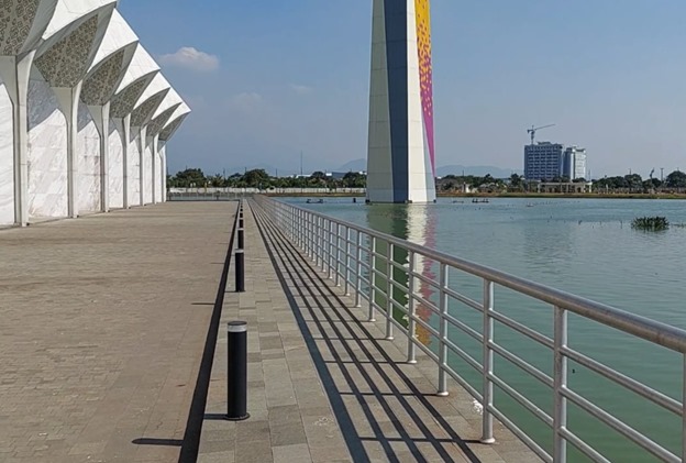 Kolam besar yang mengelilingi Masjid Al-Jabbar merupakan salah satu elemen paling memukau yang menambah keindahan dan kesakralan masjid. Sebagai pembatas antara masjid dengan dunia luar, kolam ini menciptakan suasana yang begitu menenangkan dan membawa ketenangan bagi setiap orang yang berada di sekitarnya.