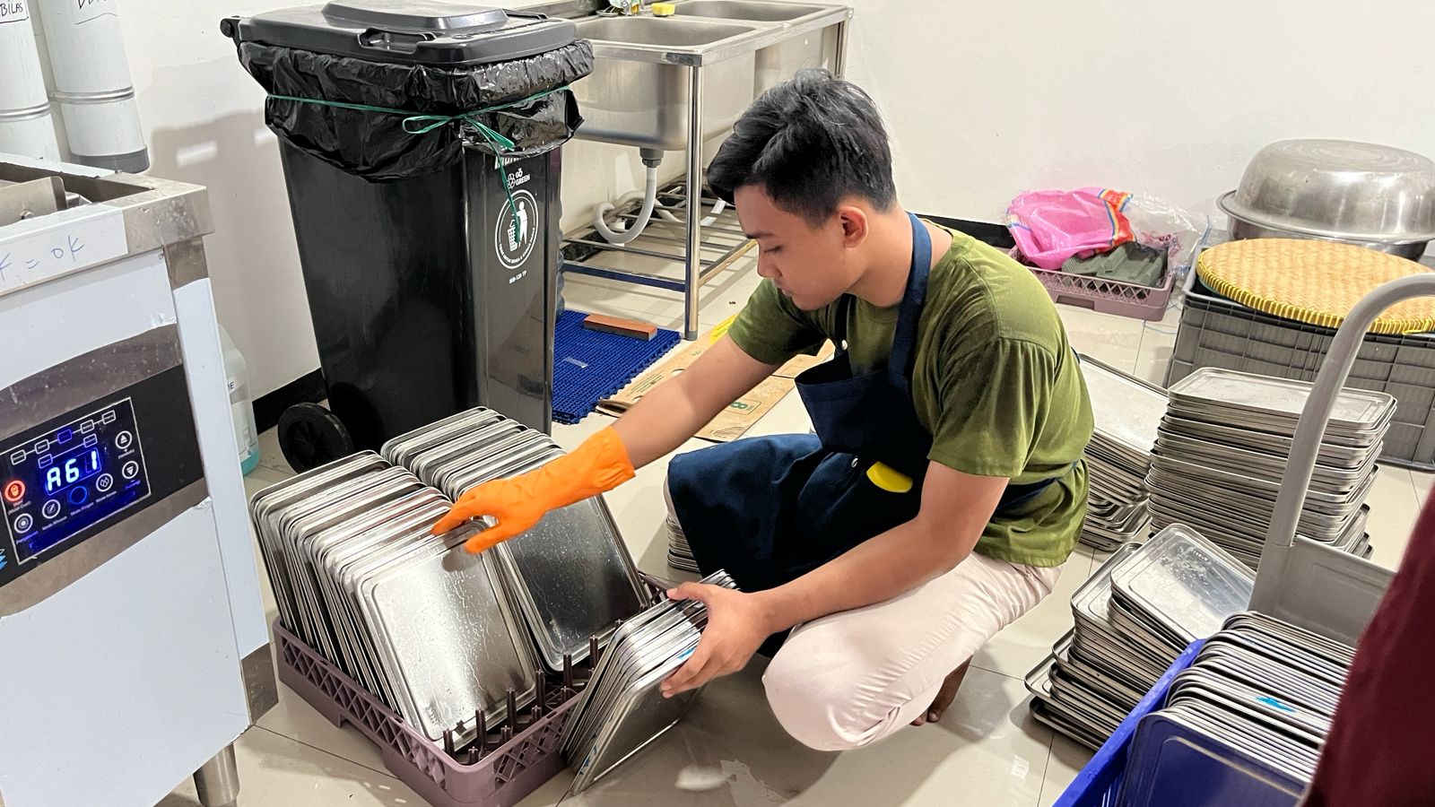 Ia menunjukkan satu per satu sudut dapur, mulai dari gudang kering, gudang basah, tempat penyimpanan stok barang, hingga tempat pemrosesan bahan makanan. “Dalam sehari, kami memasak 125 kilogram beras, dibantu alat penanak nasi khusus dengan kapasitas sampai 40 kilogram, selain itu ada mesin pencuci alat makan,” tambah Faridah.
