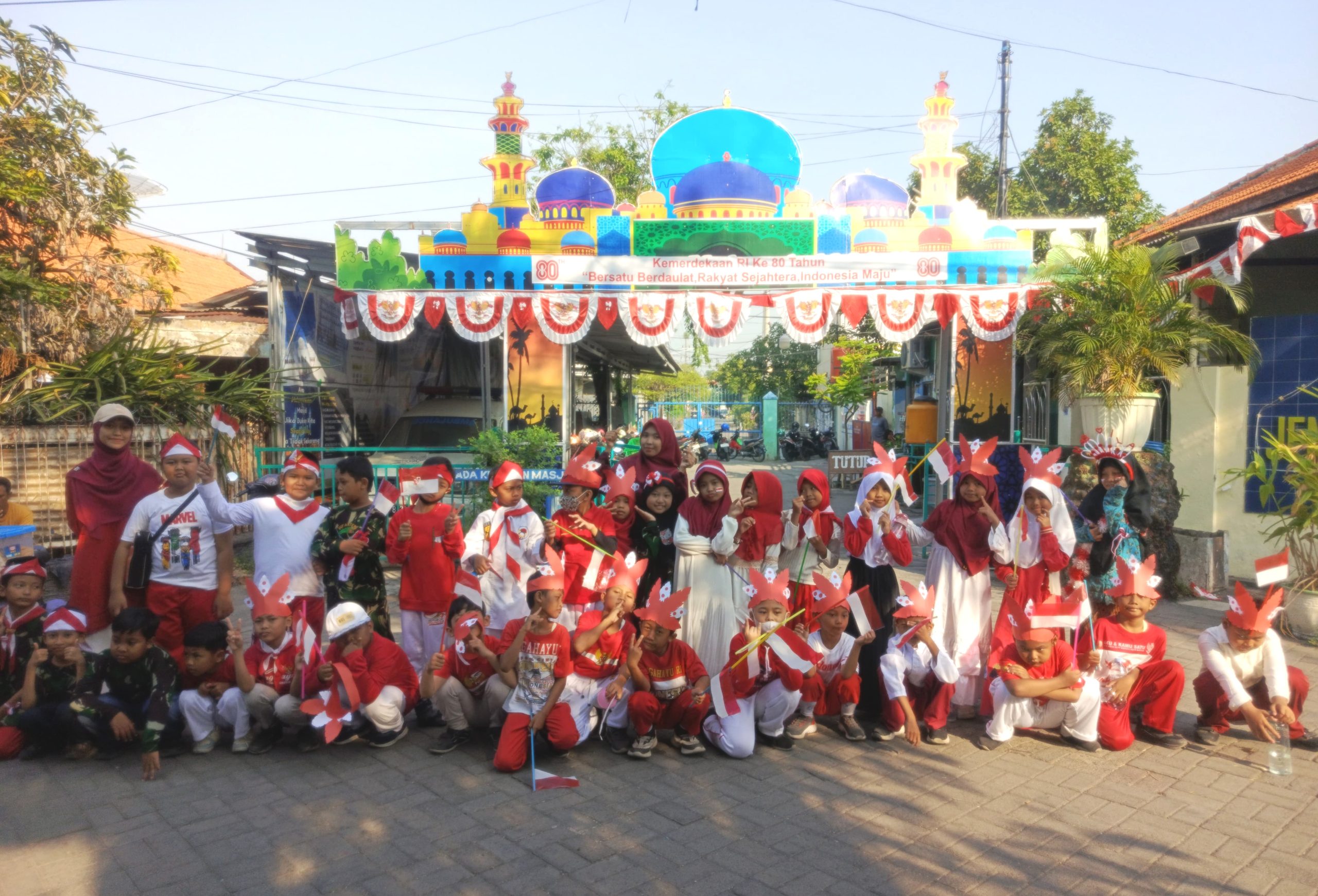 Warna merah dan putih menyala di sepanjang Jalan Sidoyoso-Granting meramaikan suasana pawai kemerdekaan HUT Ke-80 RI di SD Mumtas Sidoyoso Surabaya (Tagar.co/M. Khoirul Anam)