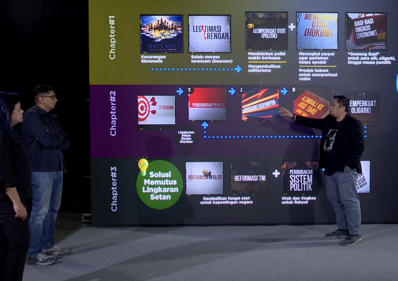 Ia menatap kamera, lalu menegaskan alasan mengapa Dirty Vote harus lahir kembali. “Kalau di Dirty Vote pertama,” katanya, “kami menggambarkan bahwa ada semacam kecurangan sistematis di balik kemenangan 58 persen yang dipegang oleh Prabowo dan Gibran.”