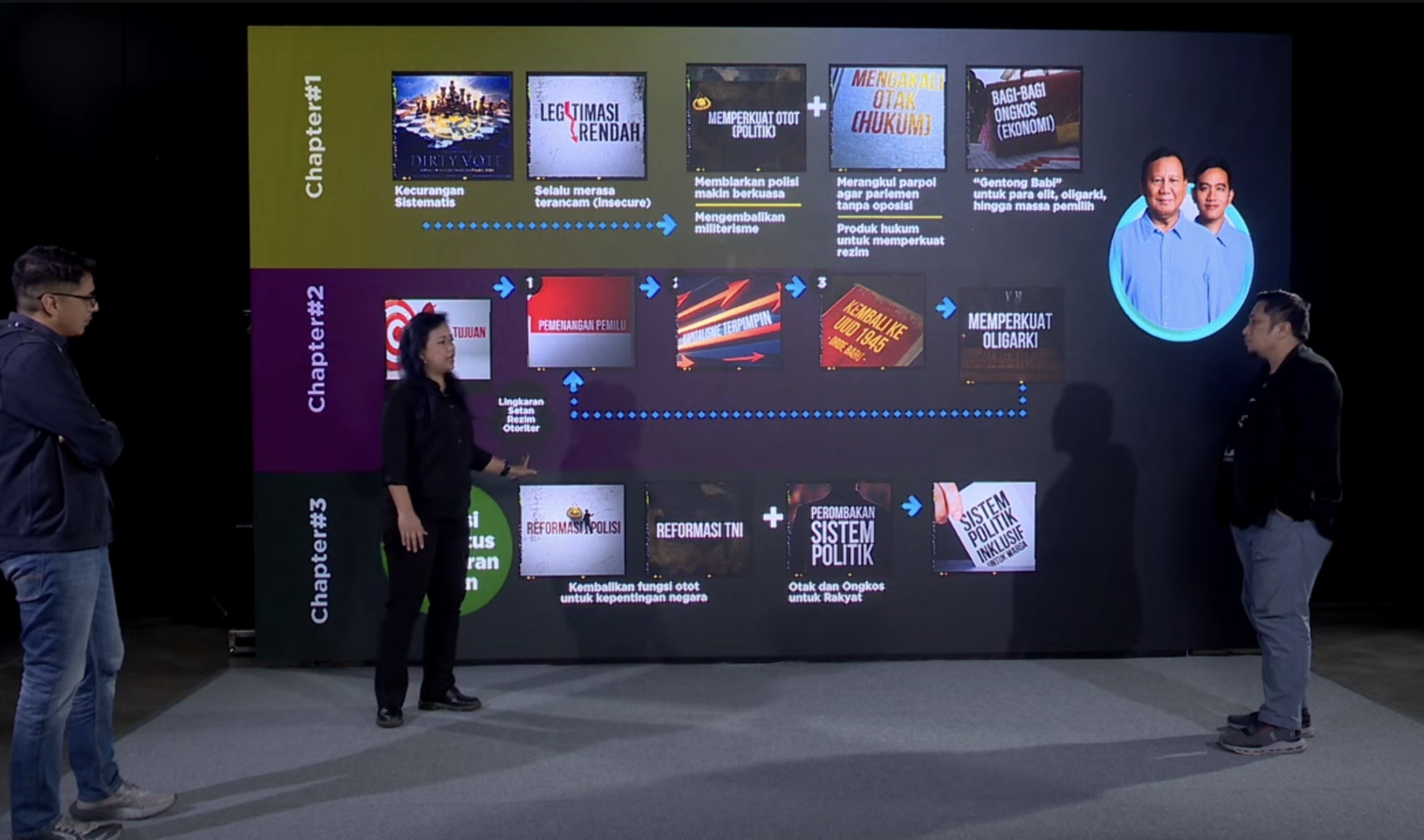 Di menit-menit terakhir bab awal, layar menampilkan kalimat besar: “Legitimasi rendah, konsolidasi kuat.”