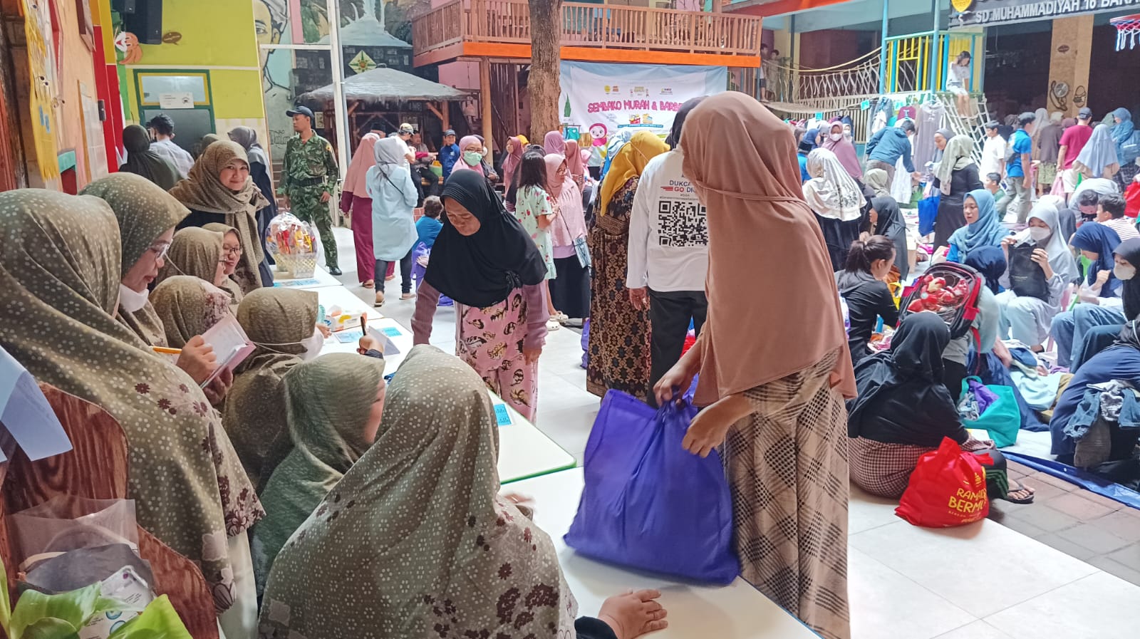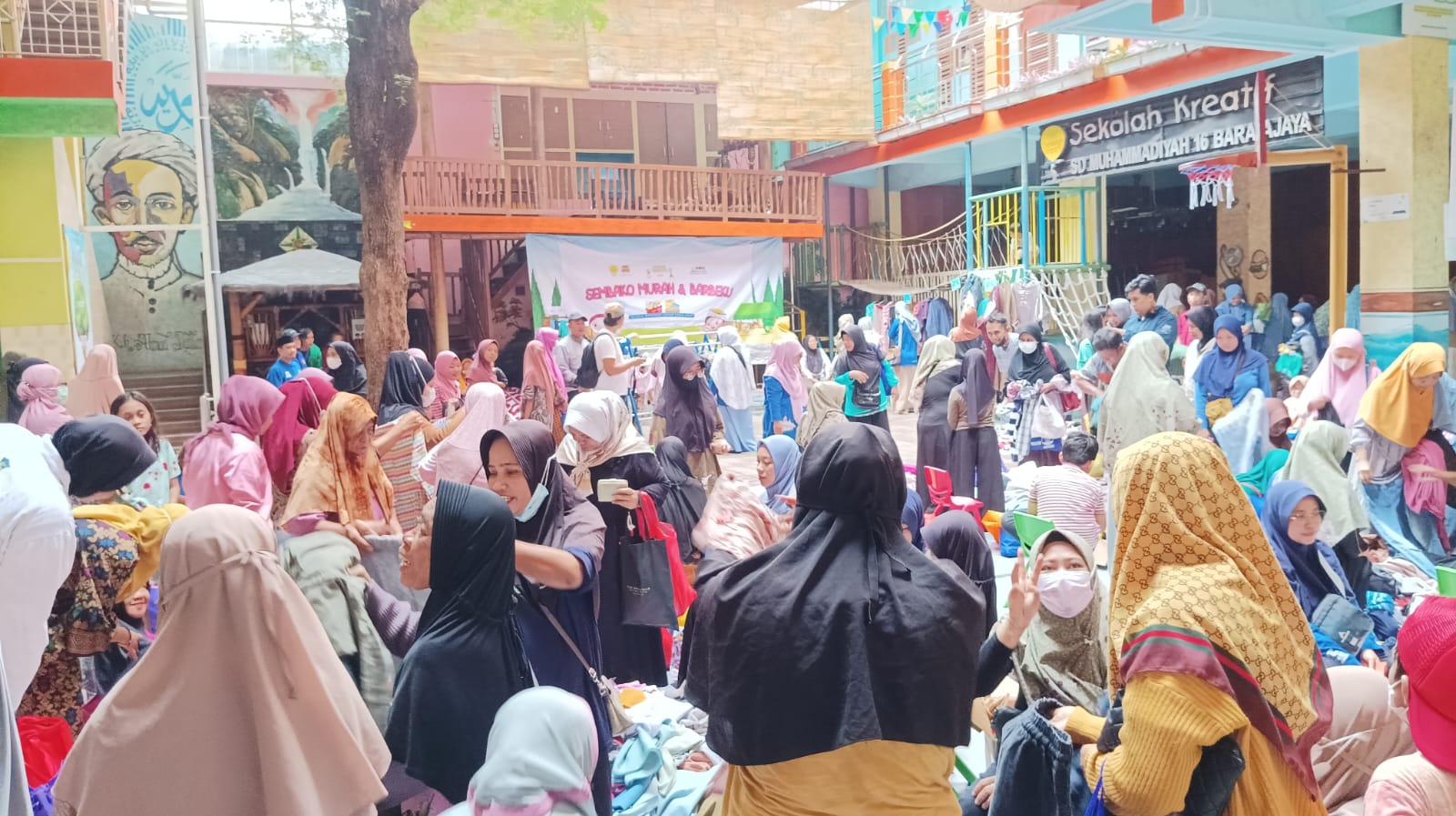 Halaman Sekolah Kreatif Baratajaya disulap jadi pasar dadakan. Ratusan warga antre sembako murah dan baju bekas berkualitas. Kegiatan tahunan ini jadi simbol Ramadan penuh kebersamaan dan kepedulian.