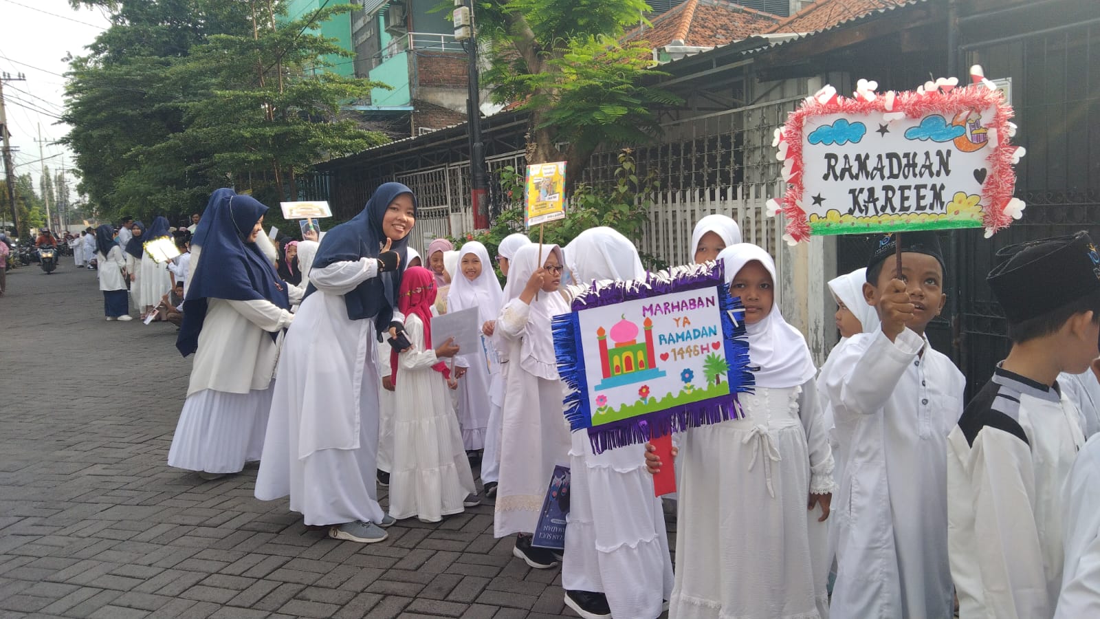 Drumben berdentum, poster ajak puasa berkibar, siswa Mumtas berseragam putih pimpin pawai tarhib. Jalanan Sidoyoso hingga Granting penuh senyum, sambut Ramadan penuh suka cita.