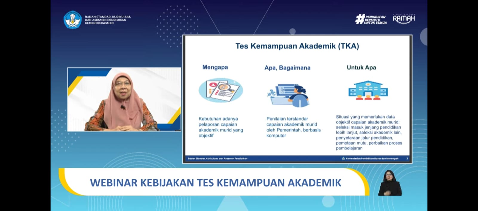 Pemerintah menjelaskan arah kebijakan tes kemampuan Akademik (TKA) sebagai instrumen peningkatan mutu, bukan ancaman bagi siswa. Abdul Mu’ti dan para pejabat BSKAP hadir dalam webinar yang diikuti ribuan peserta.