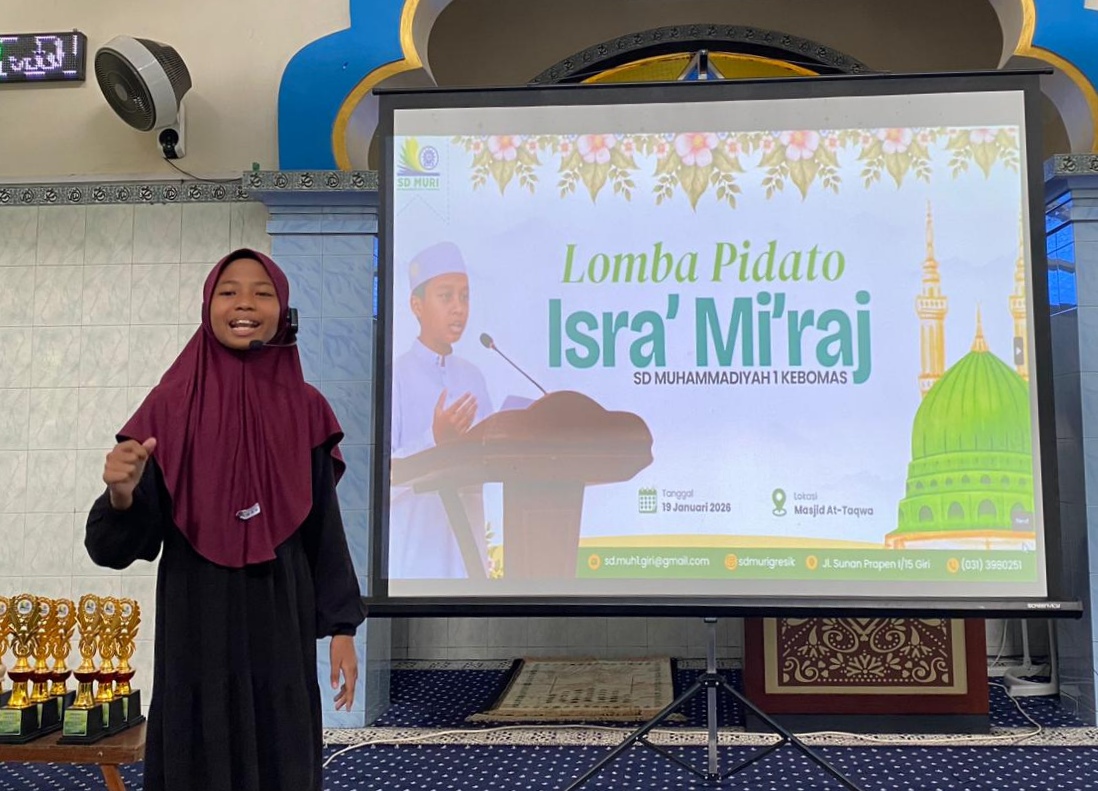 Tagar.co — Semangat berdakwah sejak dini menggema di Masjid At Taqwa Kebomas, Senin (19/1/2026). Dalam rangka memperingati Isra Mikraj Nabi Muhammad Saw., SD Muhammadiyah 1 Kebomas (SD Muri) Gresik, Jawa Timur, menggelar pemilihan pidato cilik (pildacil) yang diikuti siswa kelas I hingga VI.